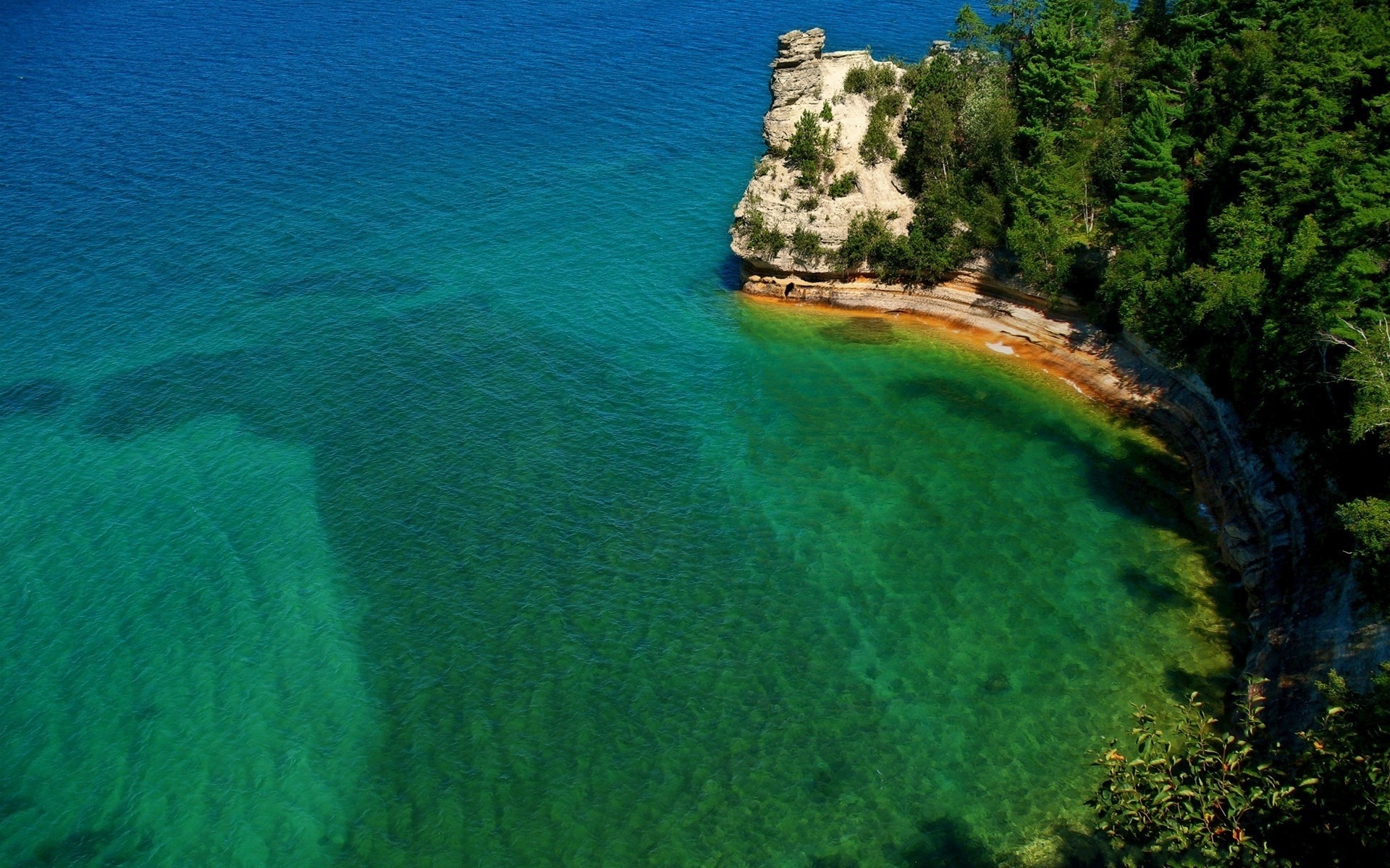 Description: A body of water with a rock outcropping in the middle of it and a shoreline with trees on both sides.