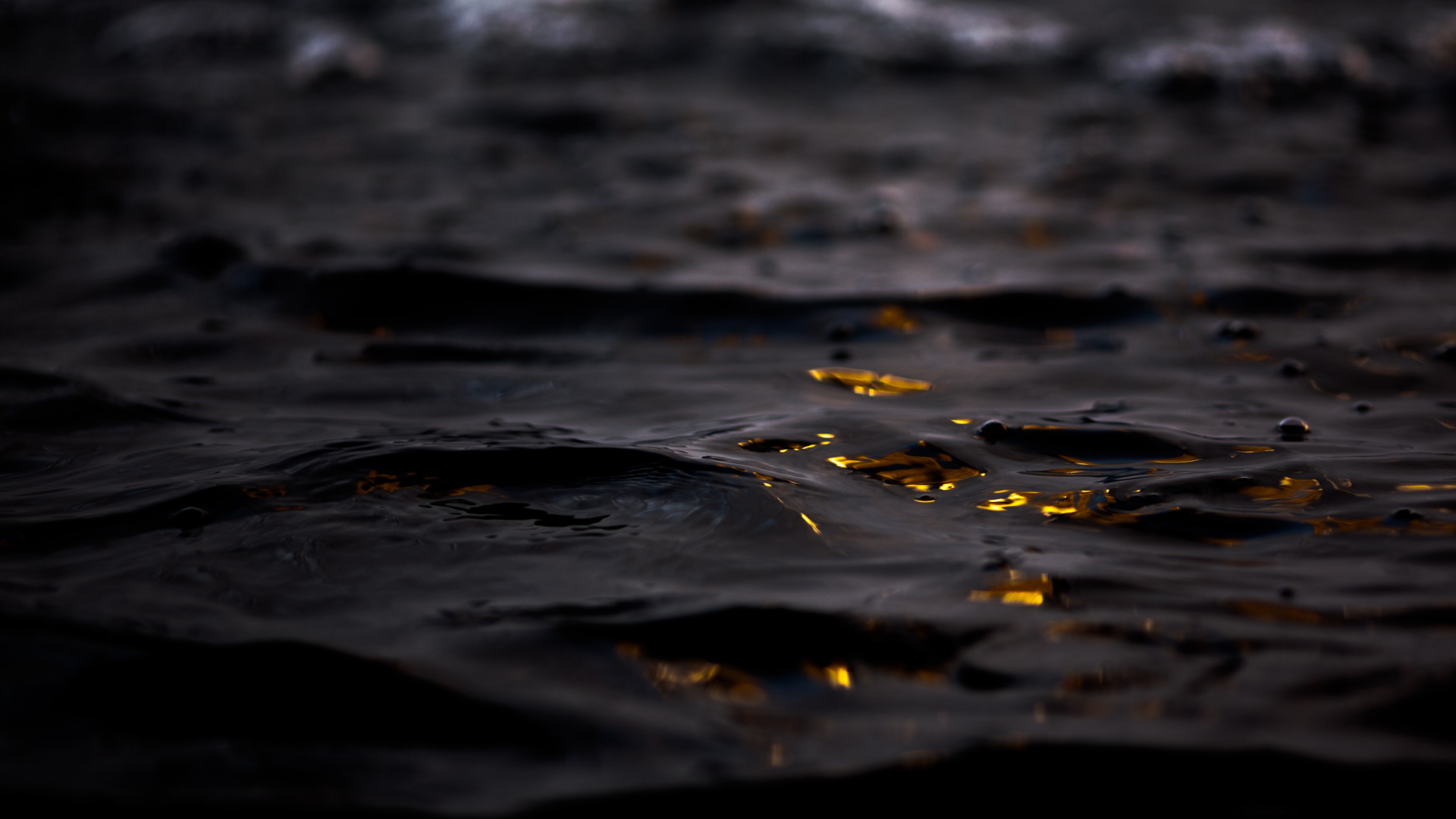 Description: A close up of water with a yellow light in the middle of it and a dark background with a few drops of water.