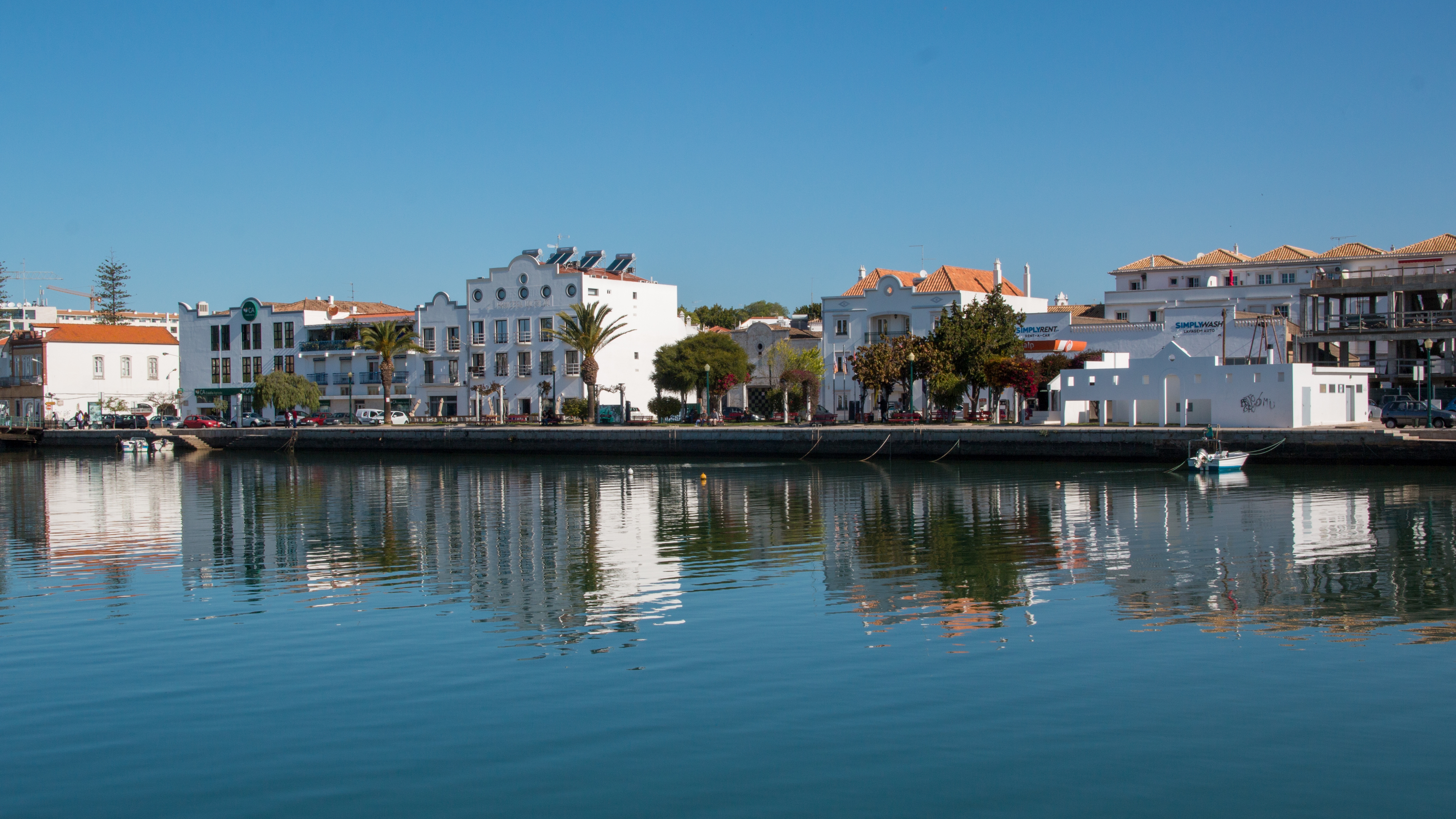 Description: A body of water with a boat in it and buildings in the background and a blue sky with a few clouds.