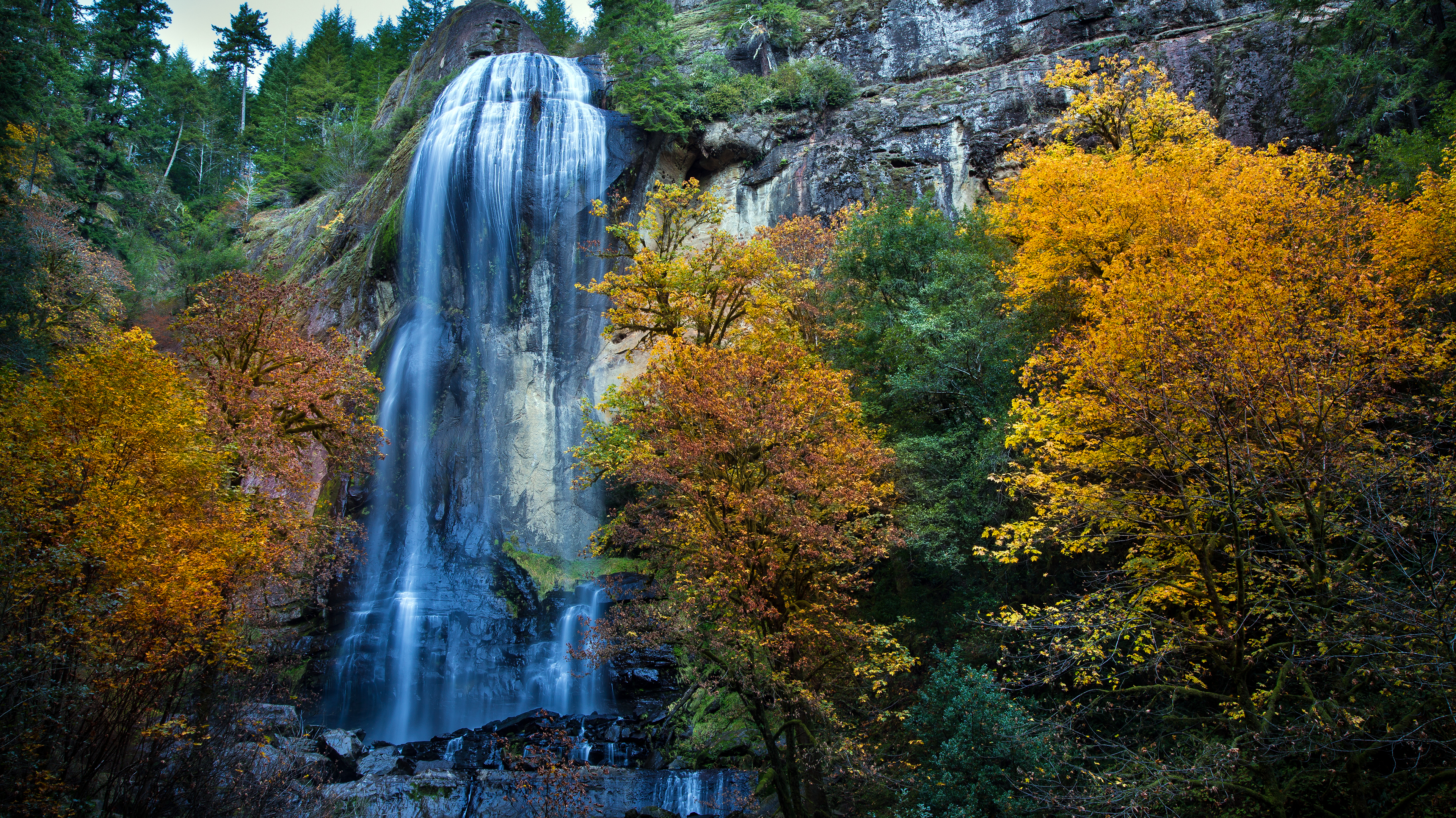 Description: A waterfall surrounded by trees and rocks in the fall season with yellow and orange leaves on the ground and a few trees with orange and yellow leaves.