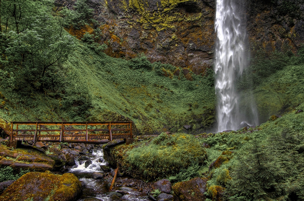 Description: A waterfall with a bridge and a wooden bridge over it and a waterfall in the background with moss growing on the rocks.