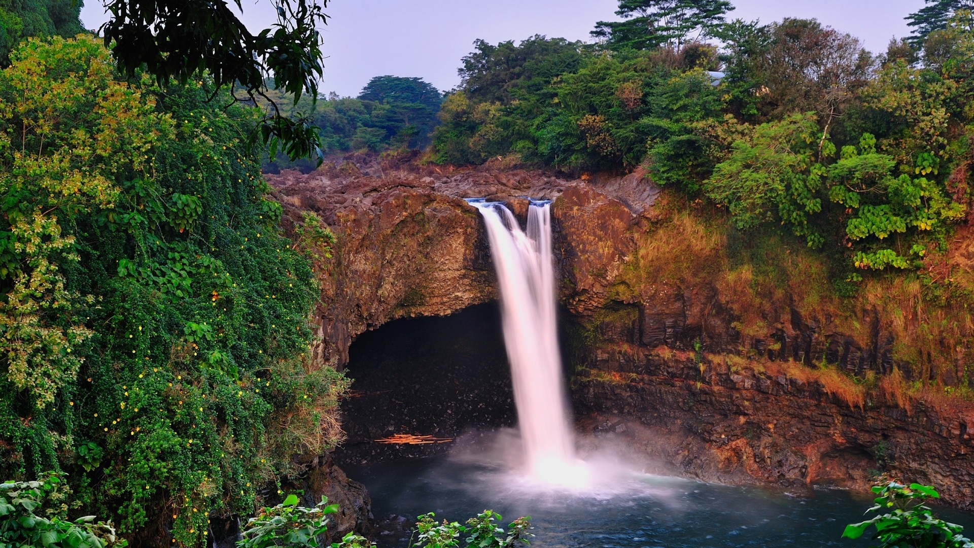 Description: A waterfall with a waterfall in the middle of it and a cave in the middle of it with a waterfall coming out of it.