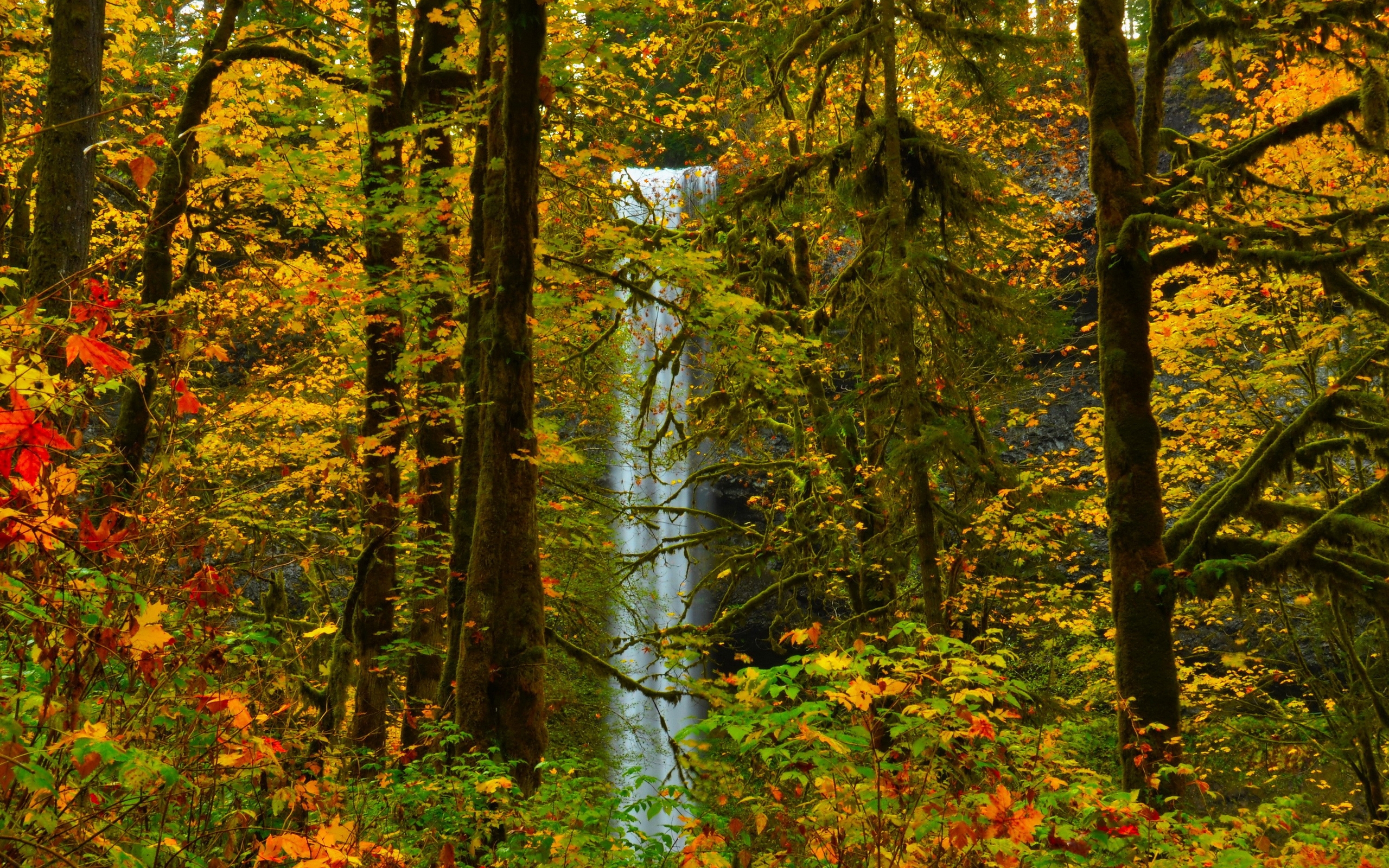 Description: A waterfall in a forest surrounded by trees with fall colors on it's leaves and foliage around it.