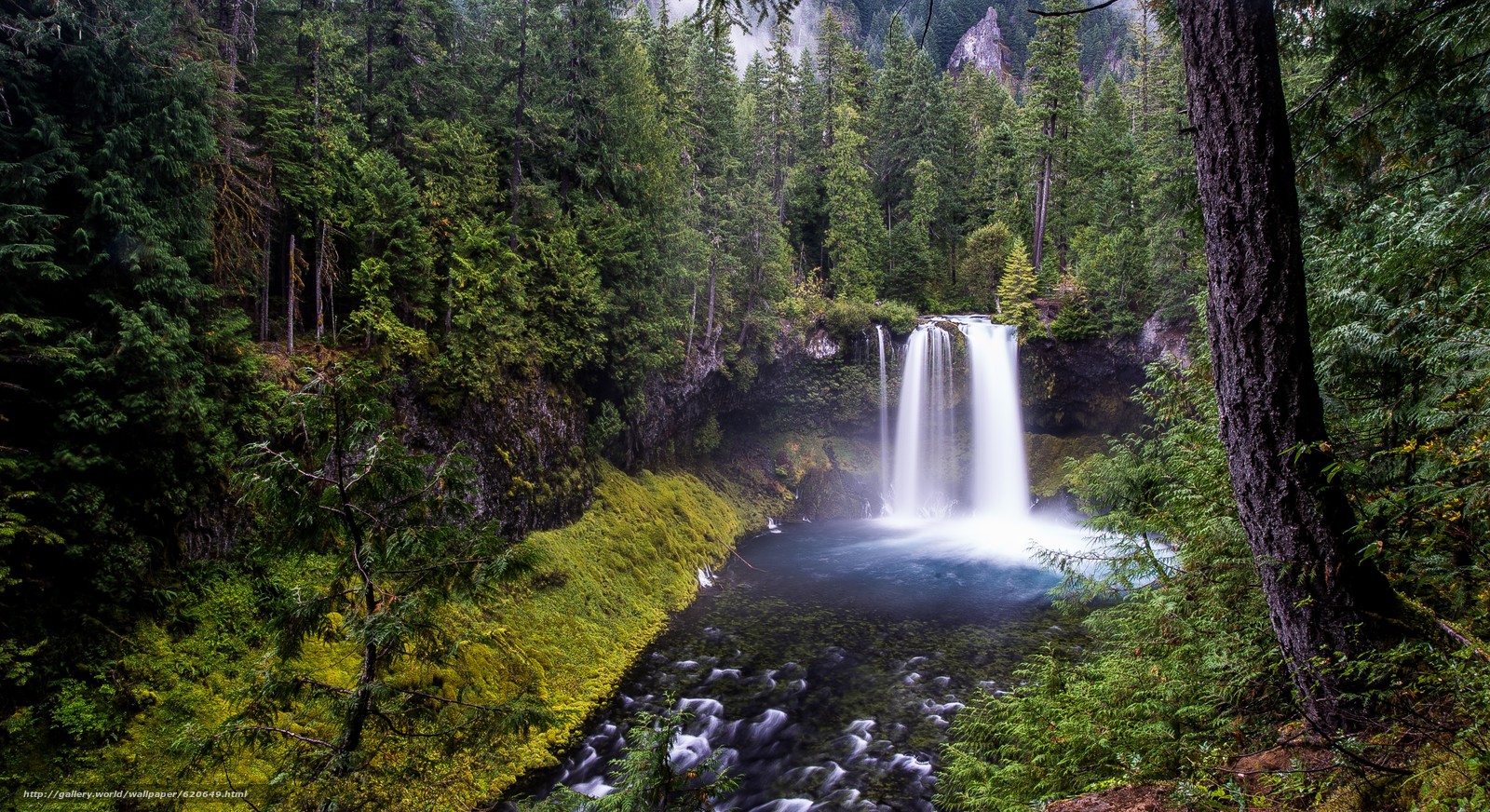 Description: A waterfall in the middle of a forest with a blue pool of water in the middle of the stream.