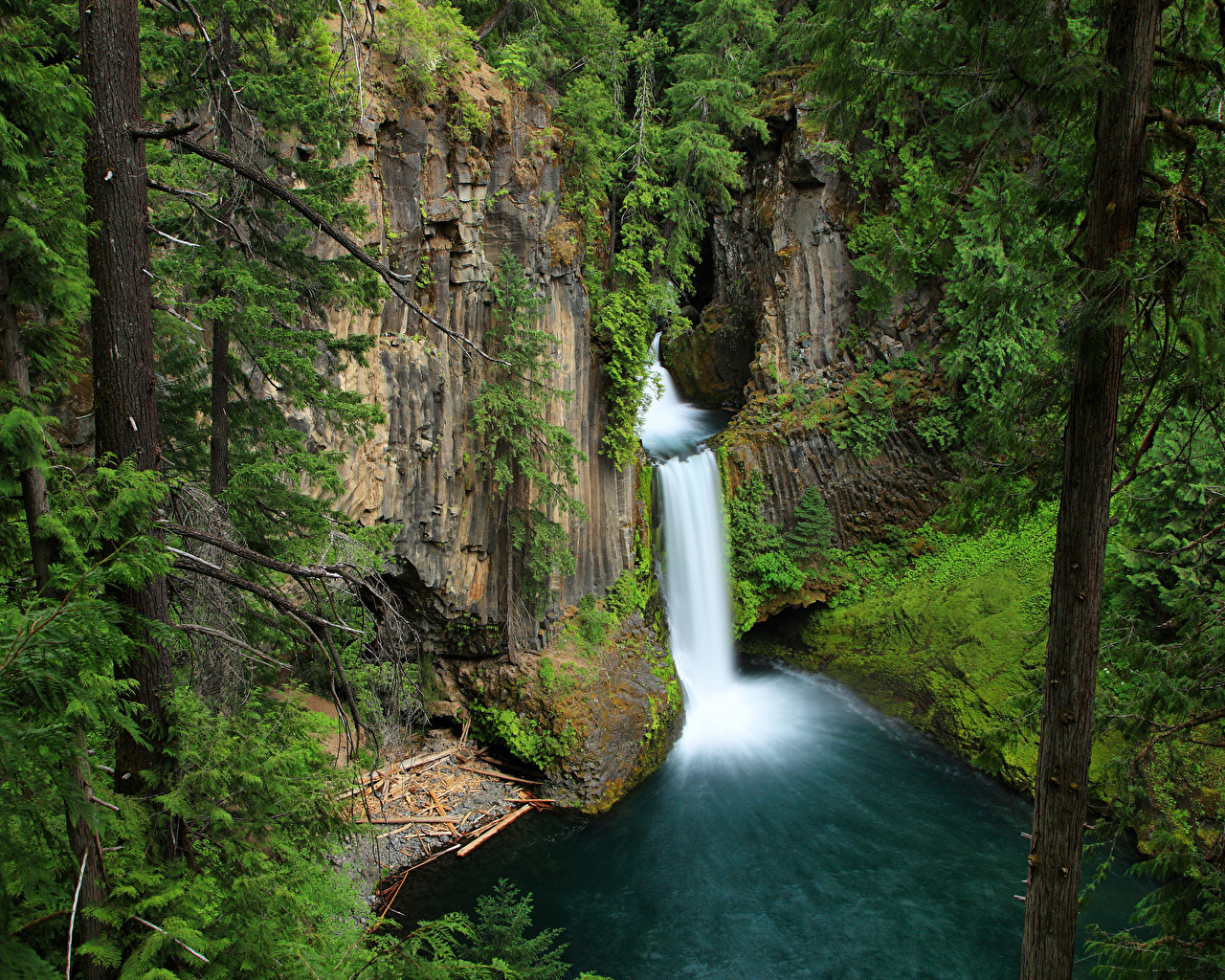 Description: A waterfall in a forest with a blue river running through it and trees surrounding it and a lush green hillside.