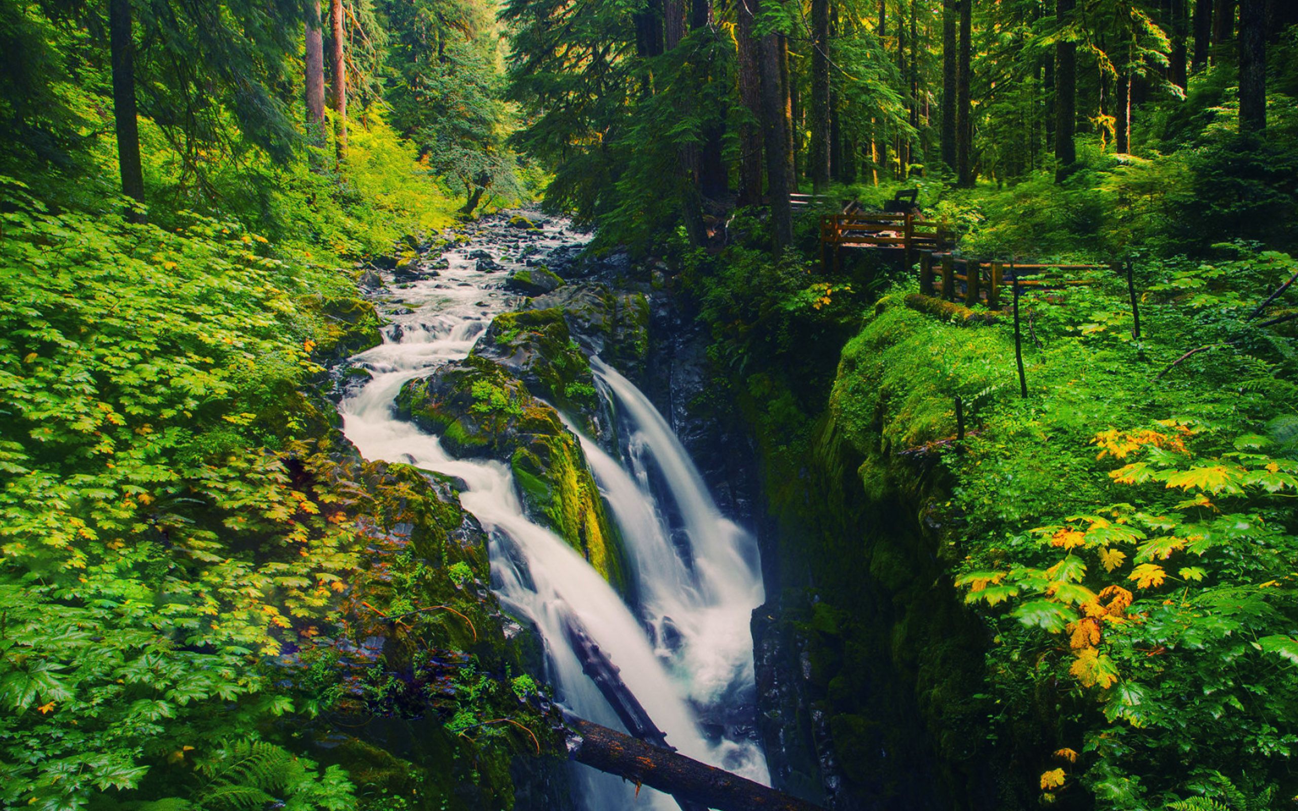Description: A waterfall in a forest with a bridge above it and trees around it and a bridge above it that is suspended over the water.