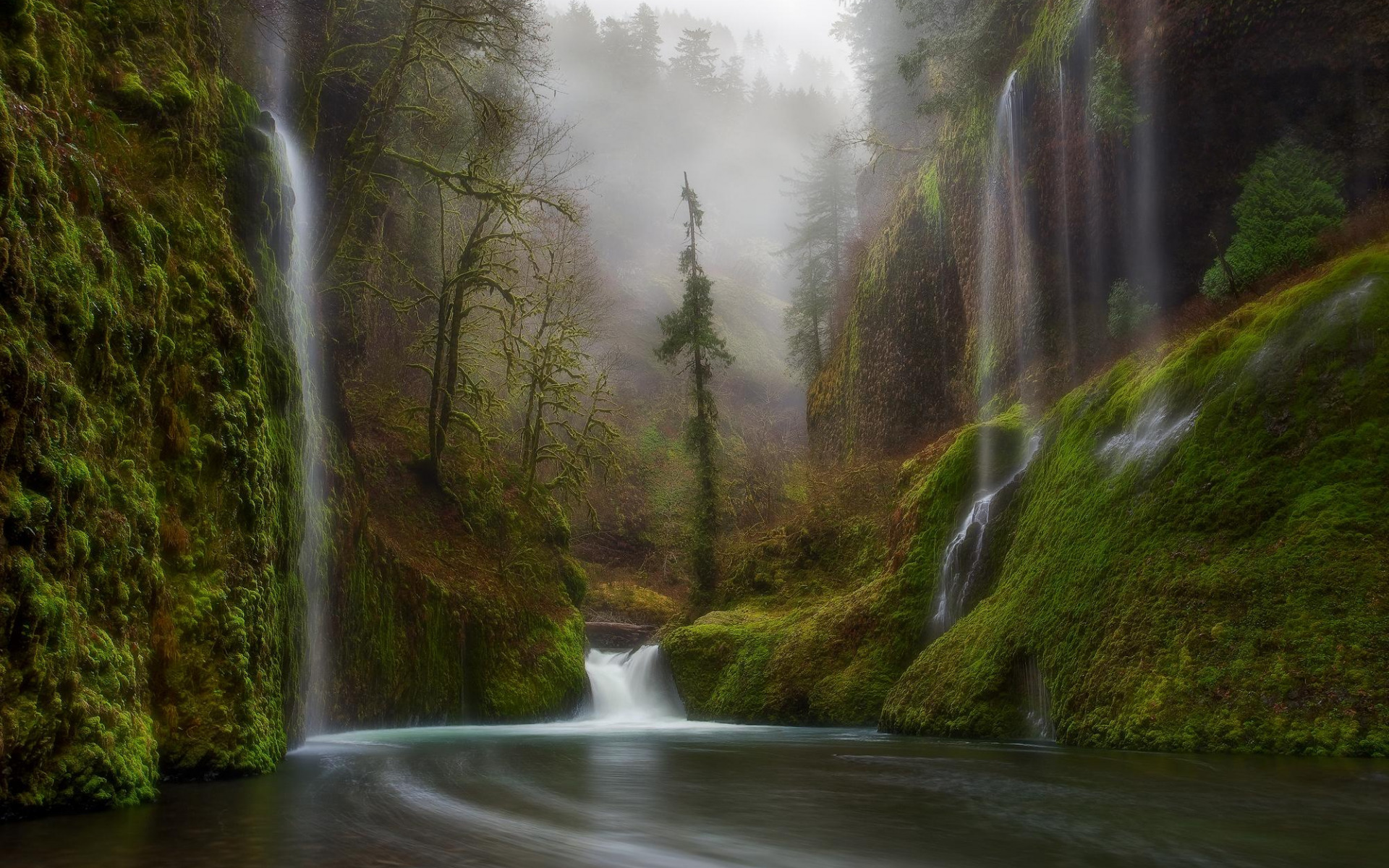 Description: A waterfall in a forest with mossy rocks and trees around it and a stream running through the middle.
