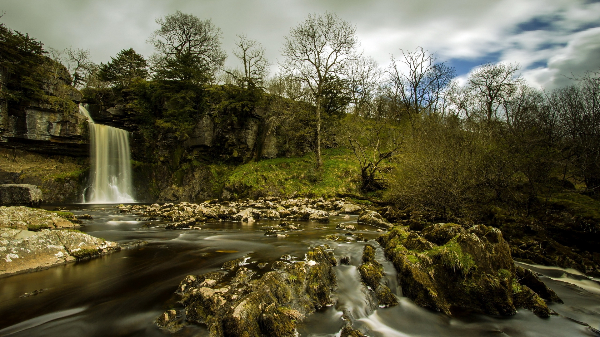 Description: A waterfall with a waterfall in the middle of it and a forest in the background with rocks and trees.