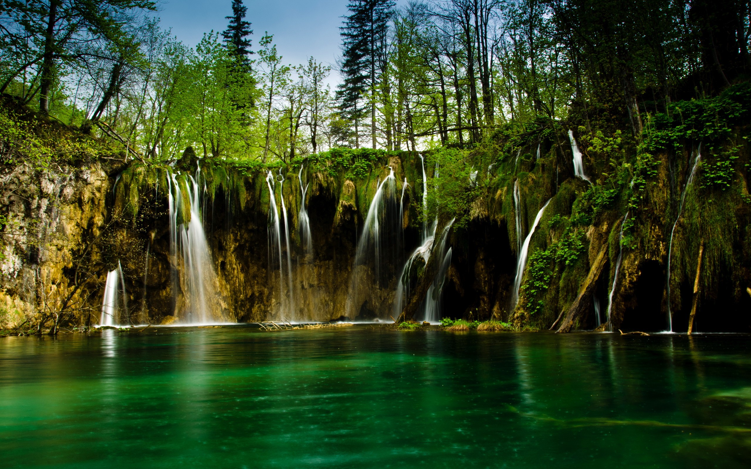Description: A waterfall with a large amount of water flowing down it's side and a forest in the background.