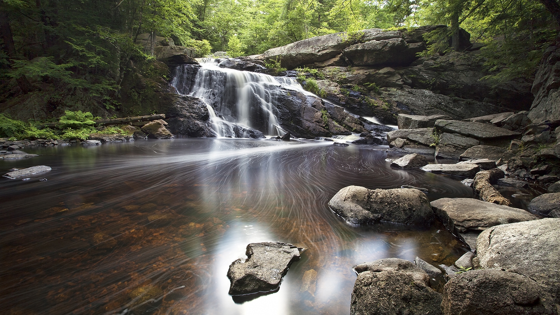 Description: A waterfall is flowing over rocks in a forest area with green trees and rocks on the ground and a few rocks on the ground.
