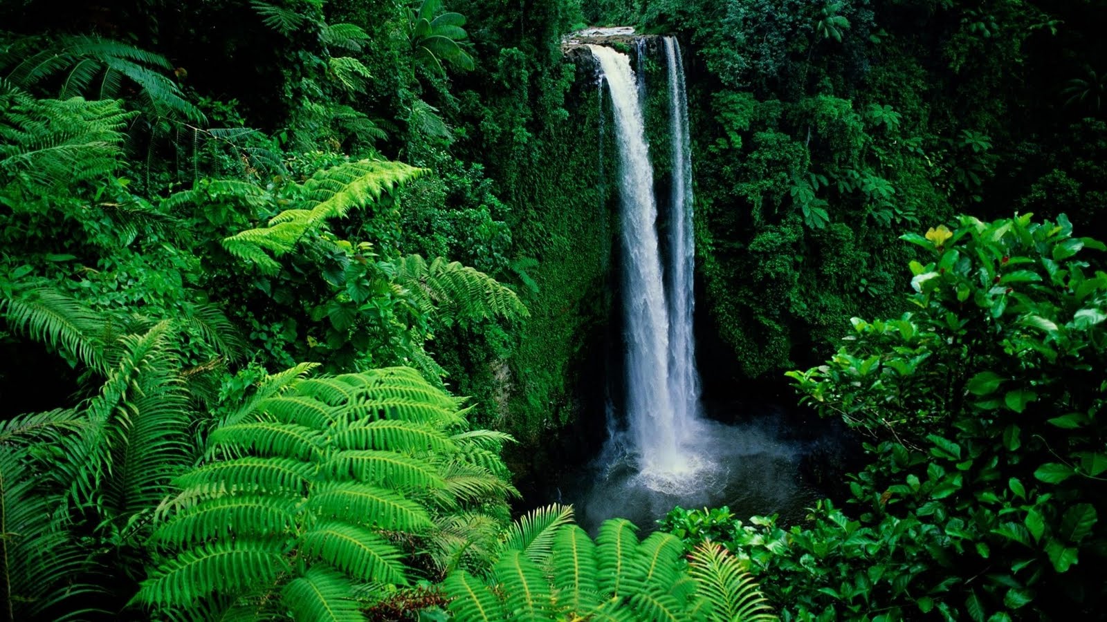 Description: A waterfall surrounded by lush green foliage and trees in the jungles of the world's largest tropical region.