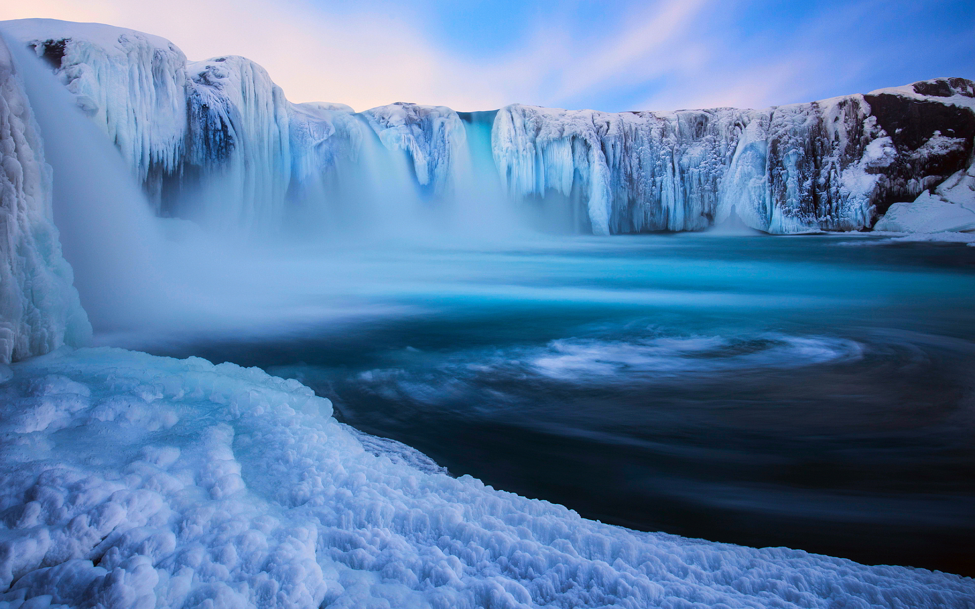 Description: A waterfall with ice on the water and a blue sky above it and a body of water below it.