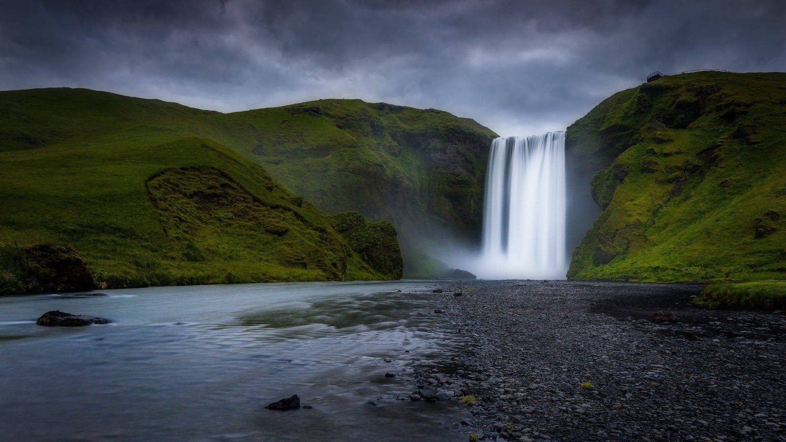 Description: A waterfall with a large waterfall in the middle of it and a river running between it and a mountain range in the background.