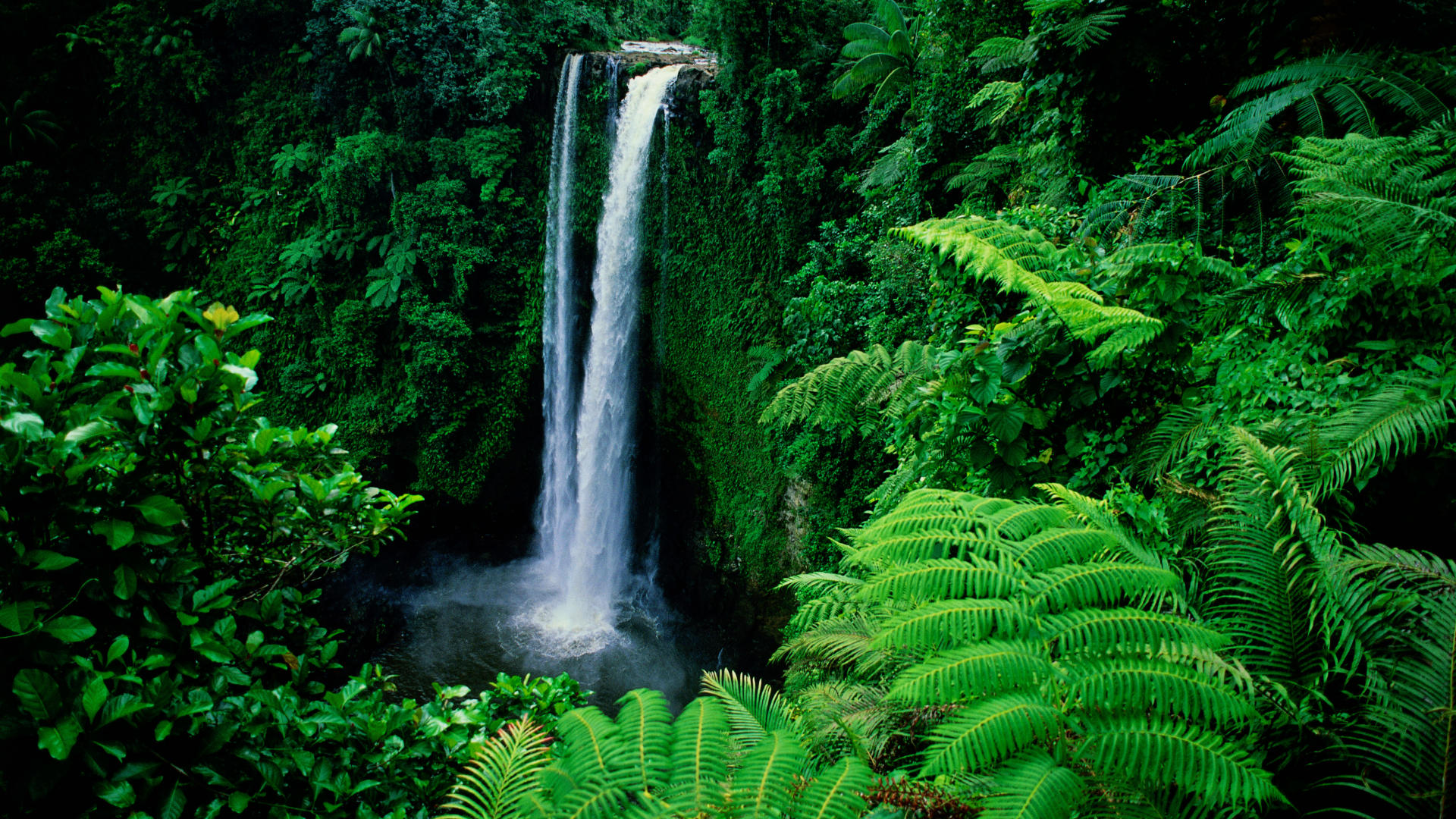Description: A waterfall surrounded by lush green foliage and trees in the jungles of a tropical country.
