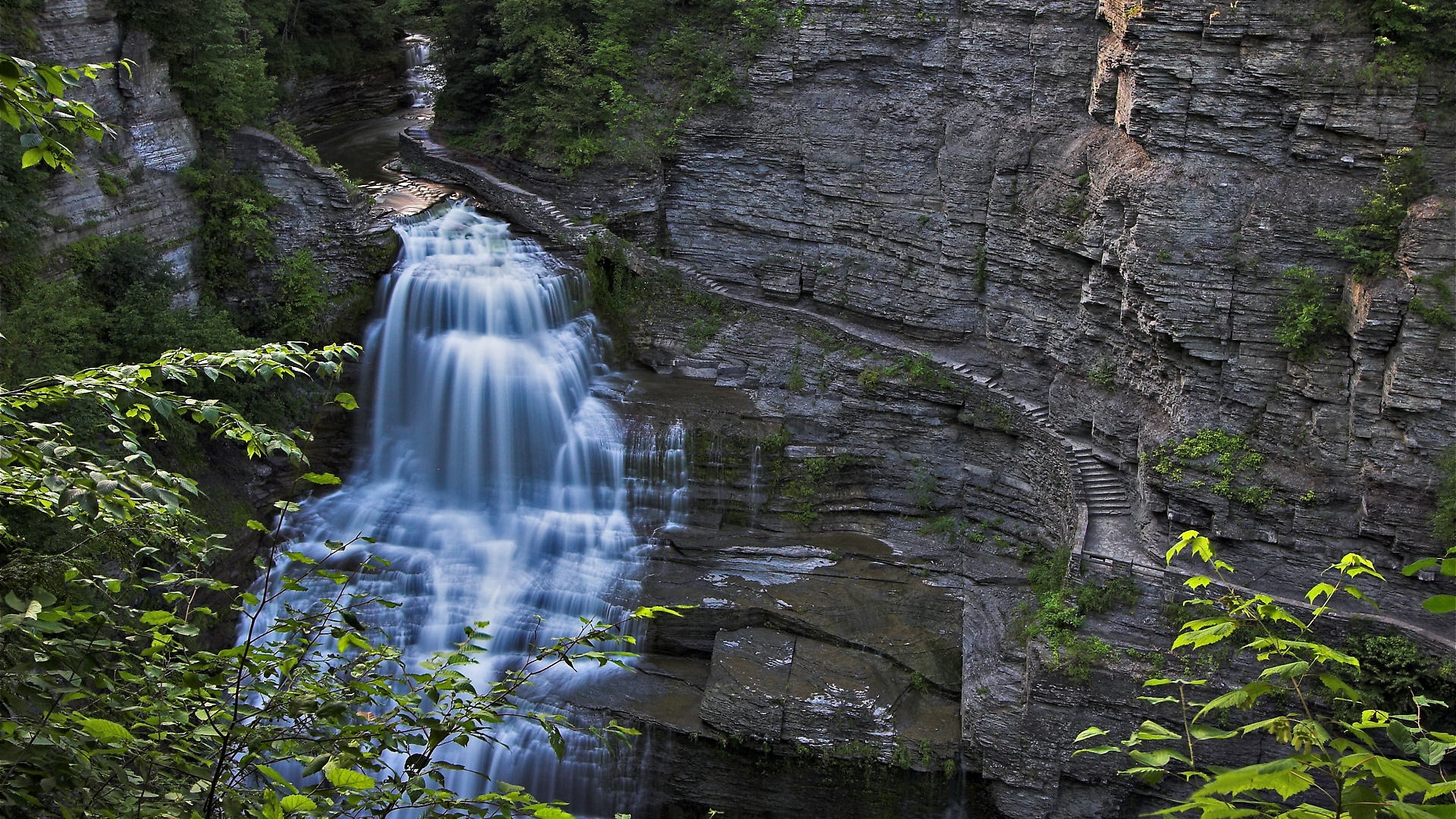 Description: A waterfall with a man standing on a ledge above it and a waterfall below it with a waterfall in the middle.