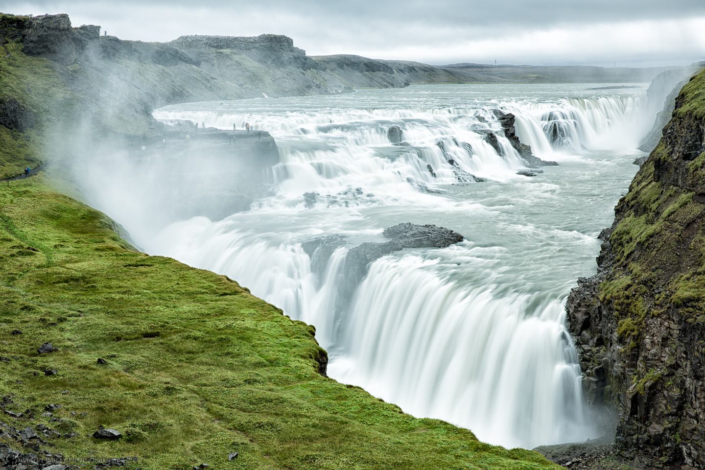 Description: A waterfall with a waterfall in the middle of it and a green field below it and a person standing on a cliff.
