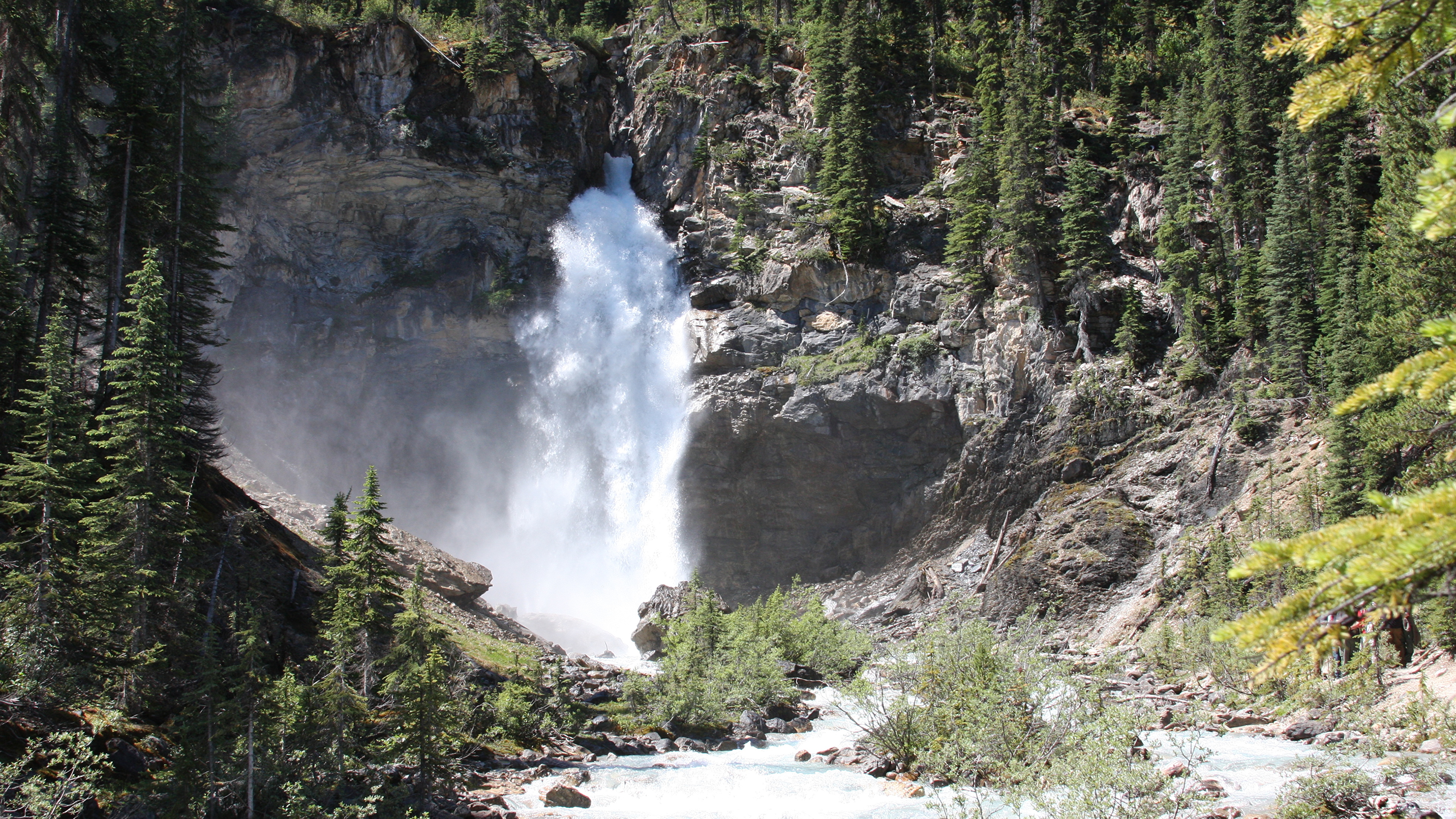 Description: A waterfall is seen from the side of a mountain side with trees around it and a river running through it.