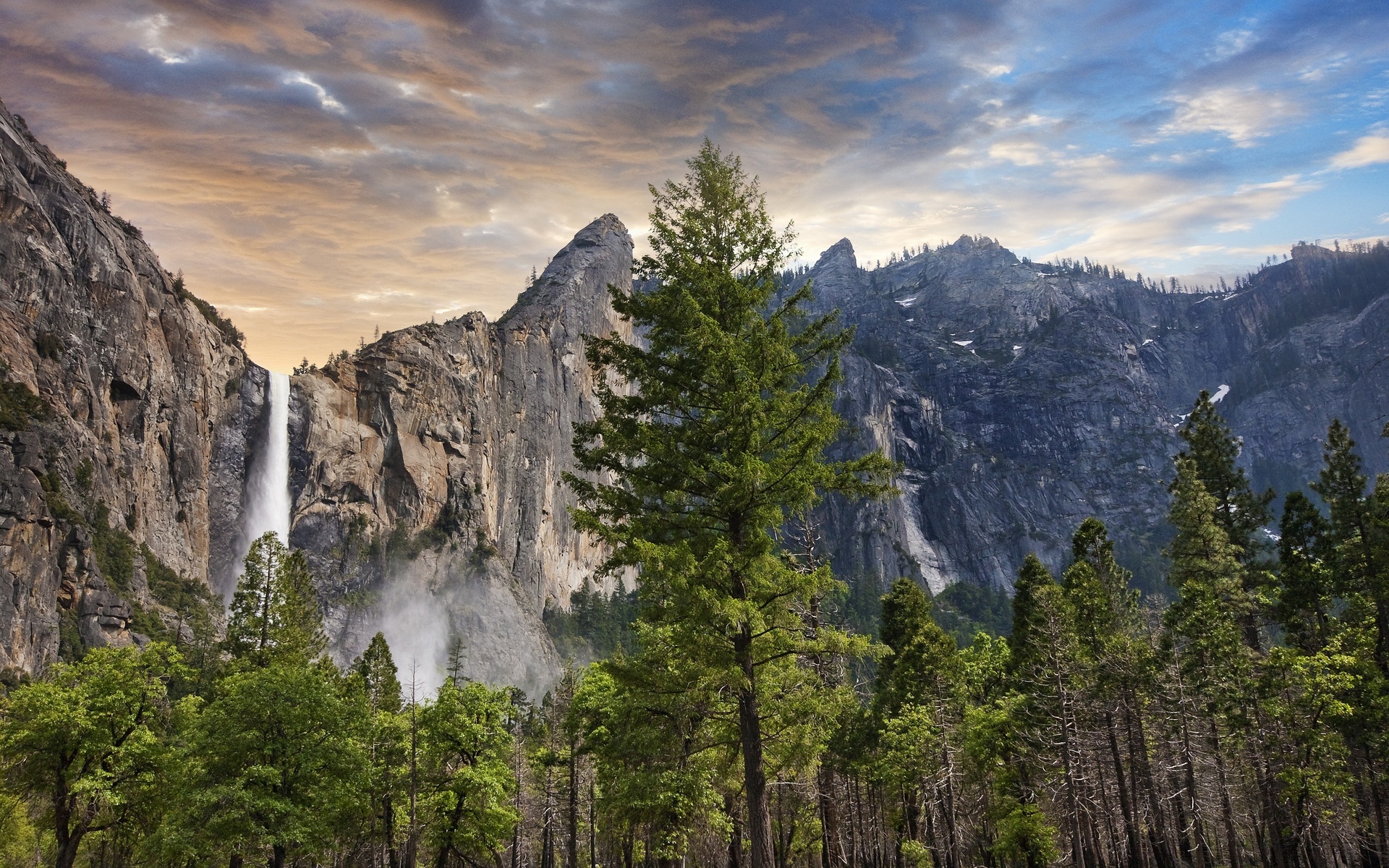 Description: A waterfall is seen in the distance between trees and mountains in the background.