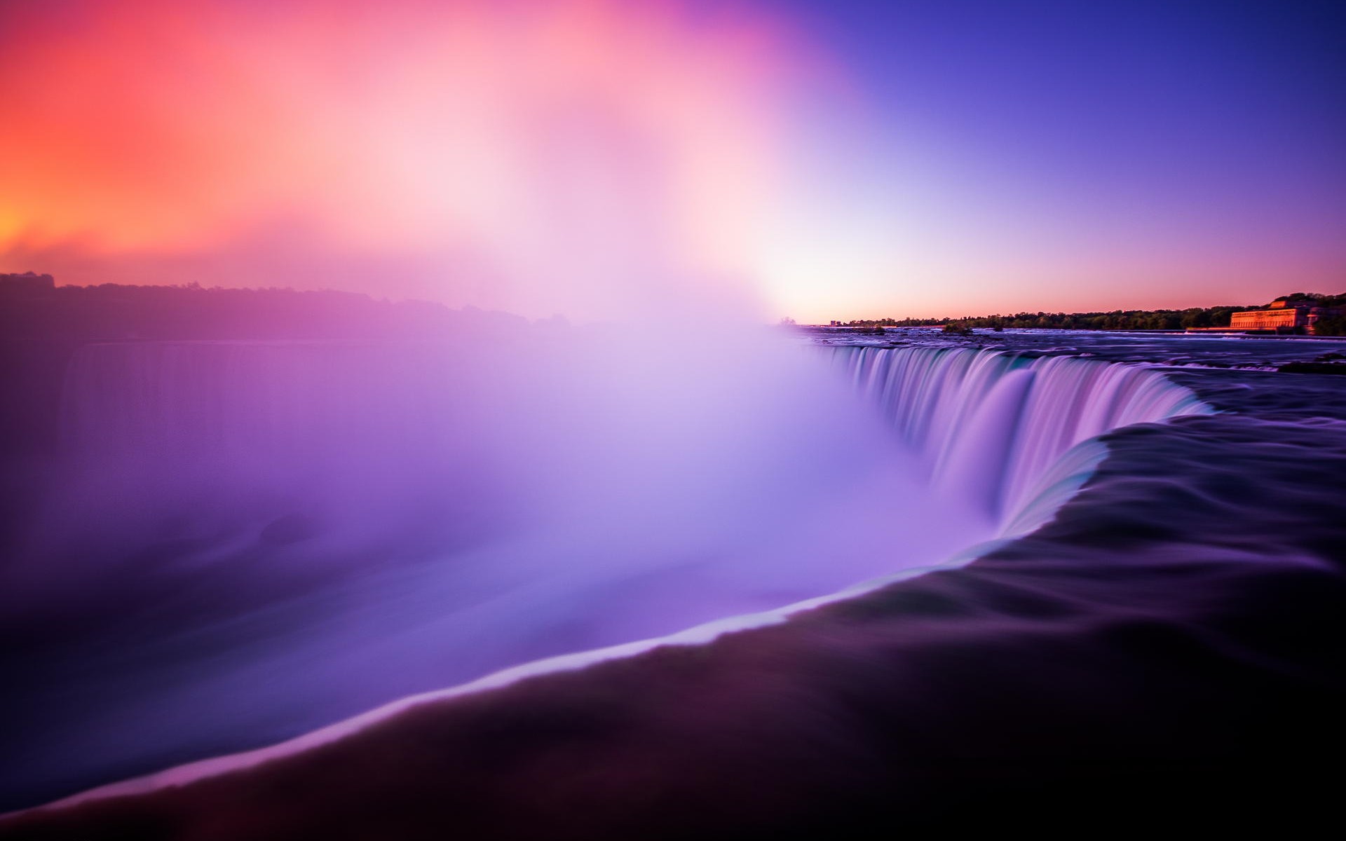 Description: A waterfall with a rainbow colored sky in the background and water flowing down it's side and a building in the distance.