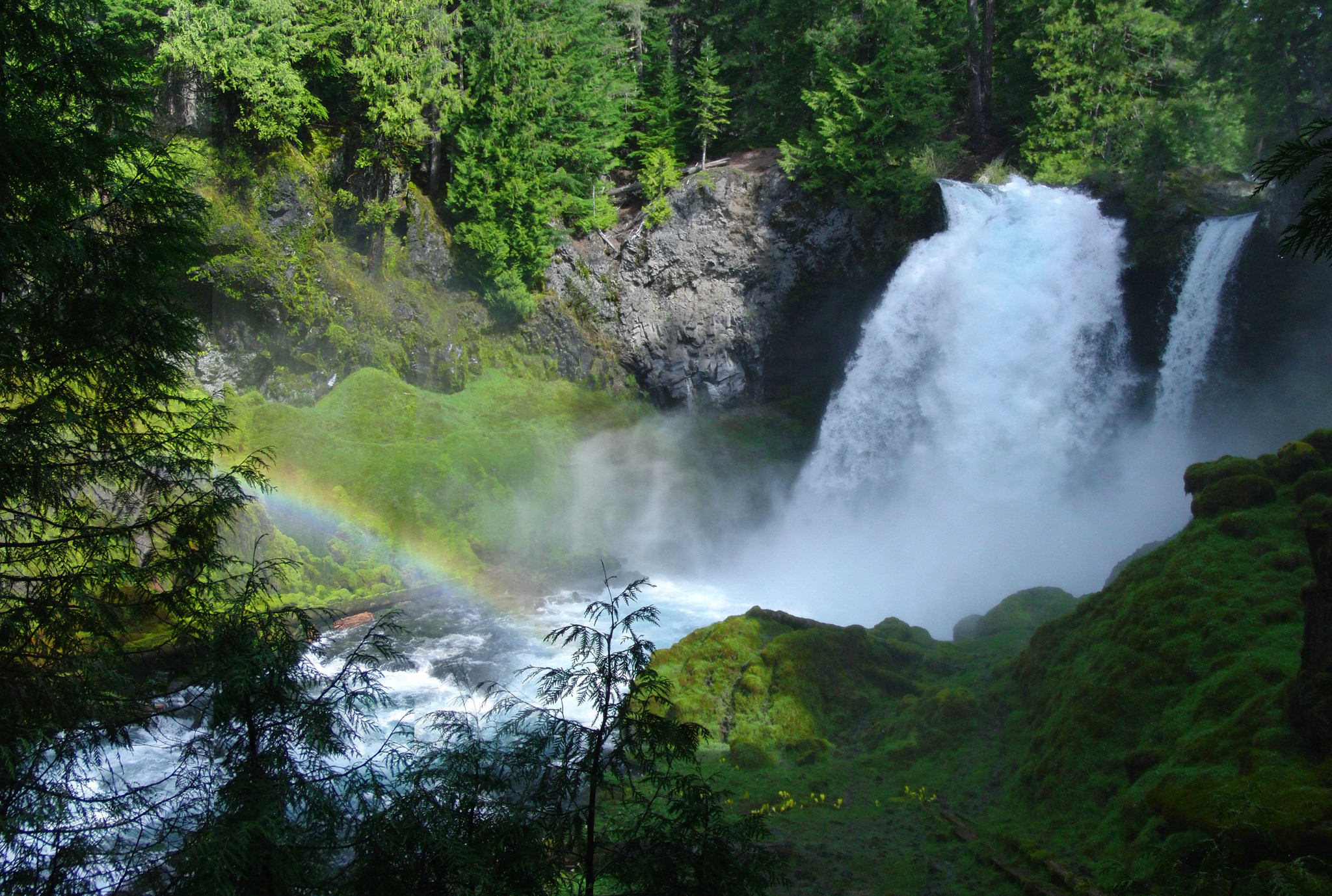 Description: A waterfall with a rainbow in the middle of it and trees around it and a rainbow in the middle of the waterfall.