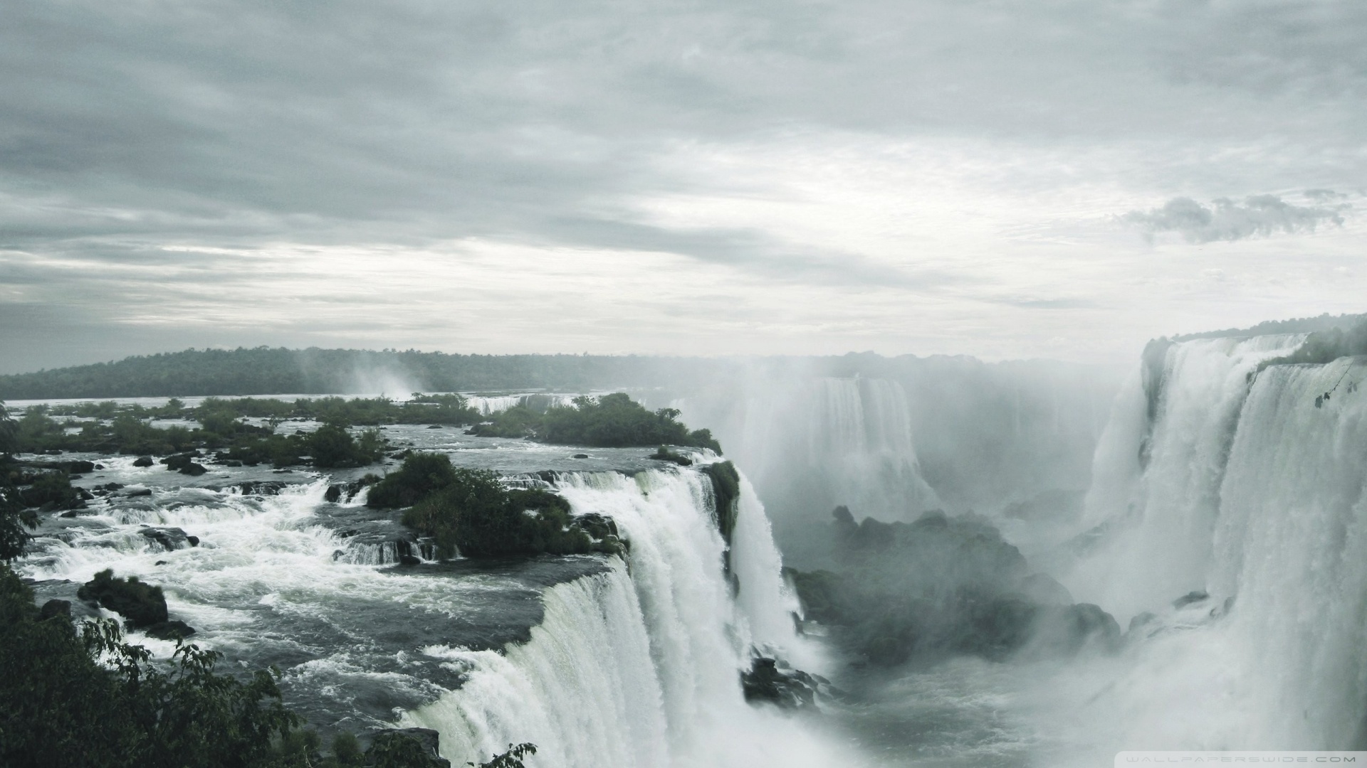 Description: A large waterfall with a river running through it and a forest below it and a cloudy sky above it.
