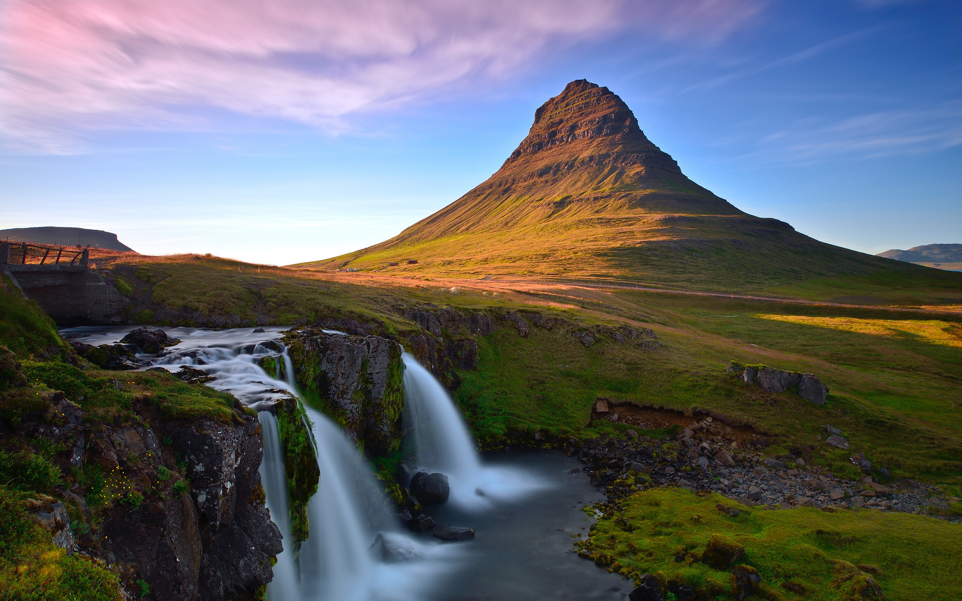 Description: A waterfall flowing into a river next to a mountain range in the distance with a bridge in the foreground.