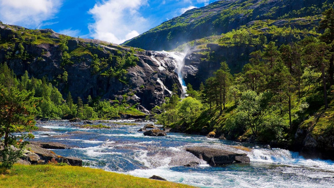 Description: A river with a waterfall in the middle of it and trees around it and a grassy area with rocks and grass.