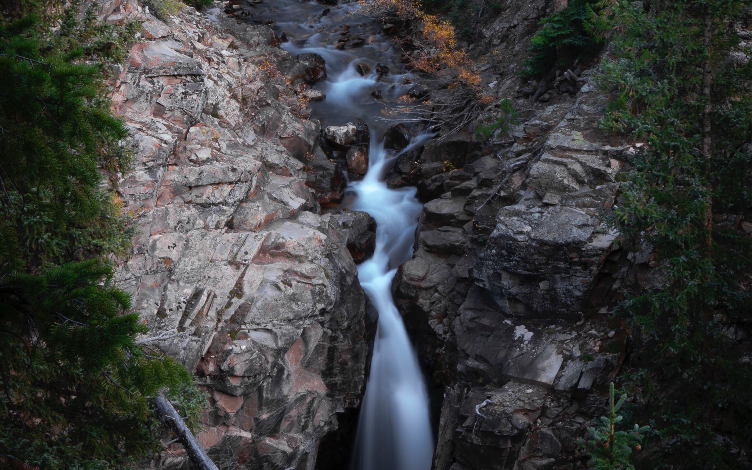 Description: A waterfall flowing down a rocky mountain side into a river surrounded by trees and rocks with a few leaves on the ground.