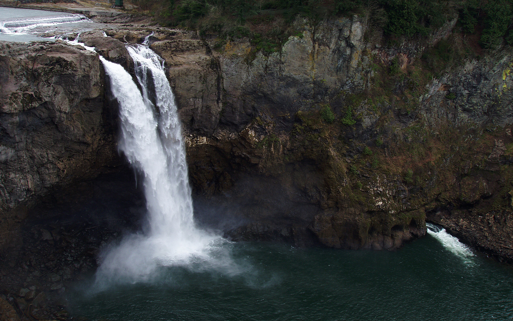 Description: A waterfall with a waterfall coming out of it's side into a body of water with a boat in the water.