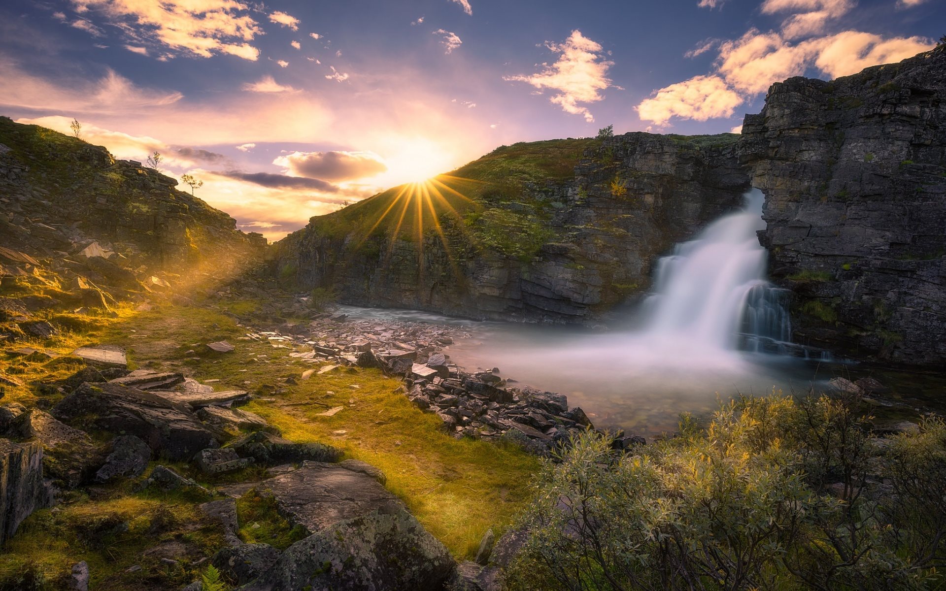 Description: A waterfall with a bright sun shining through the clouds above it and a grassy area below it with rocks and grass.