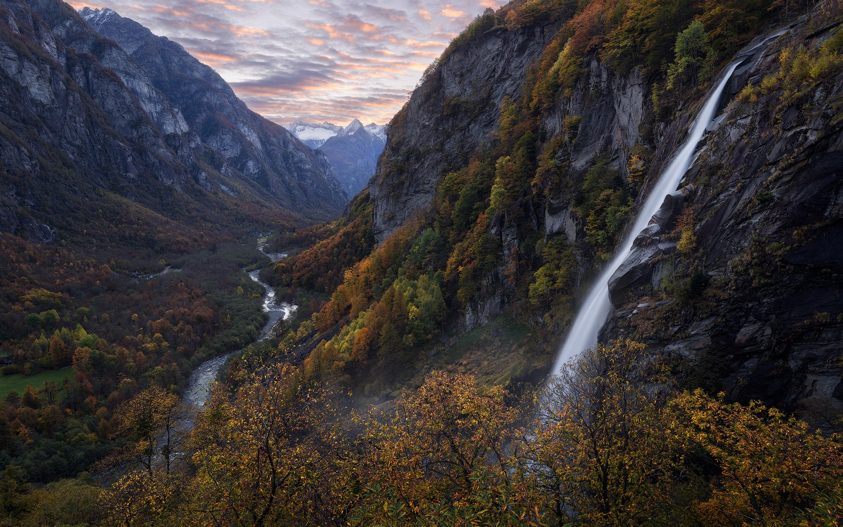 Description: A waterfall in a valley surrounded by mountains and trees with fall foliage on the ground and below it is a colorful sky.