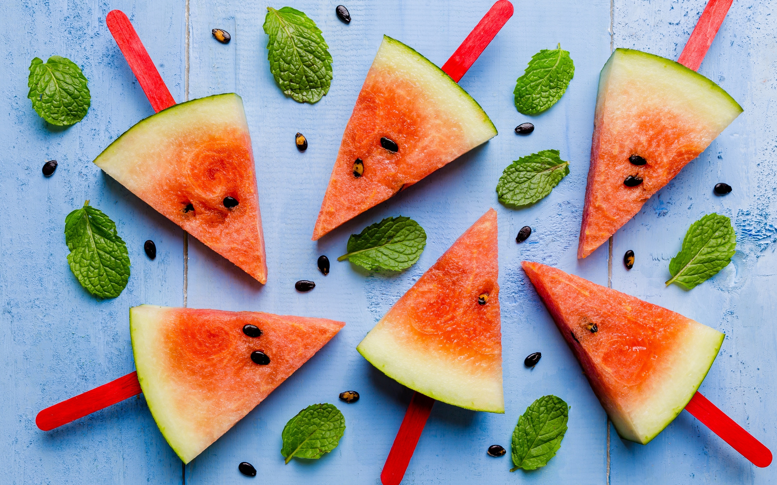 Description: A group of slices of watermelon with mint leaves on a blue surface with pops sticks and mint.
