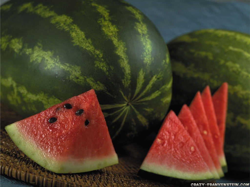 Description: A group of watermelon slices on a table with one slice cut in half and the other half eaten.