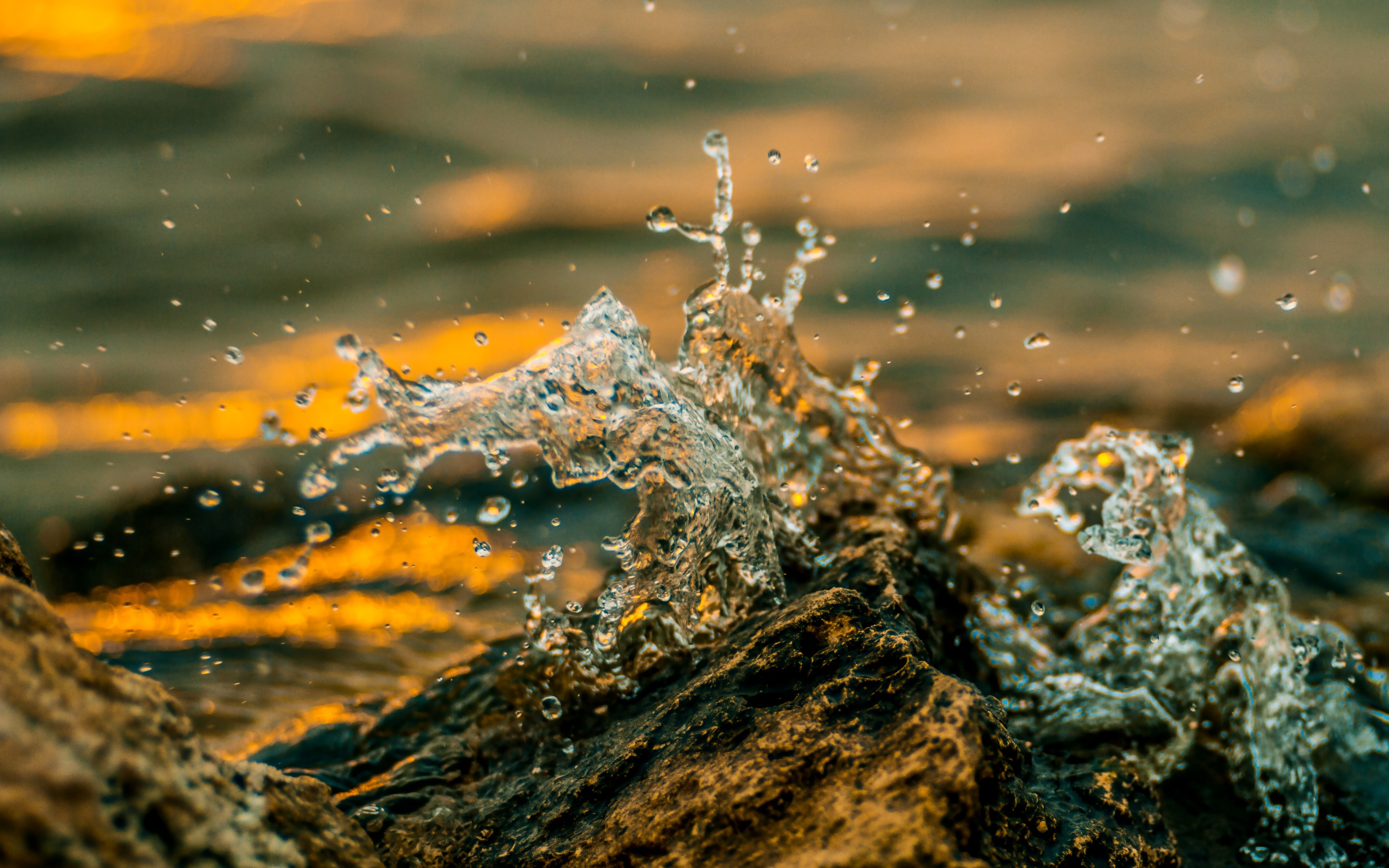 Description: A close up of a wave hitting a rock in the water with a yellow background and a yellow light.