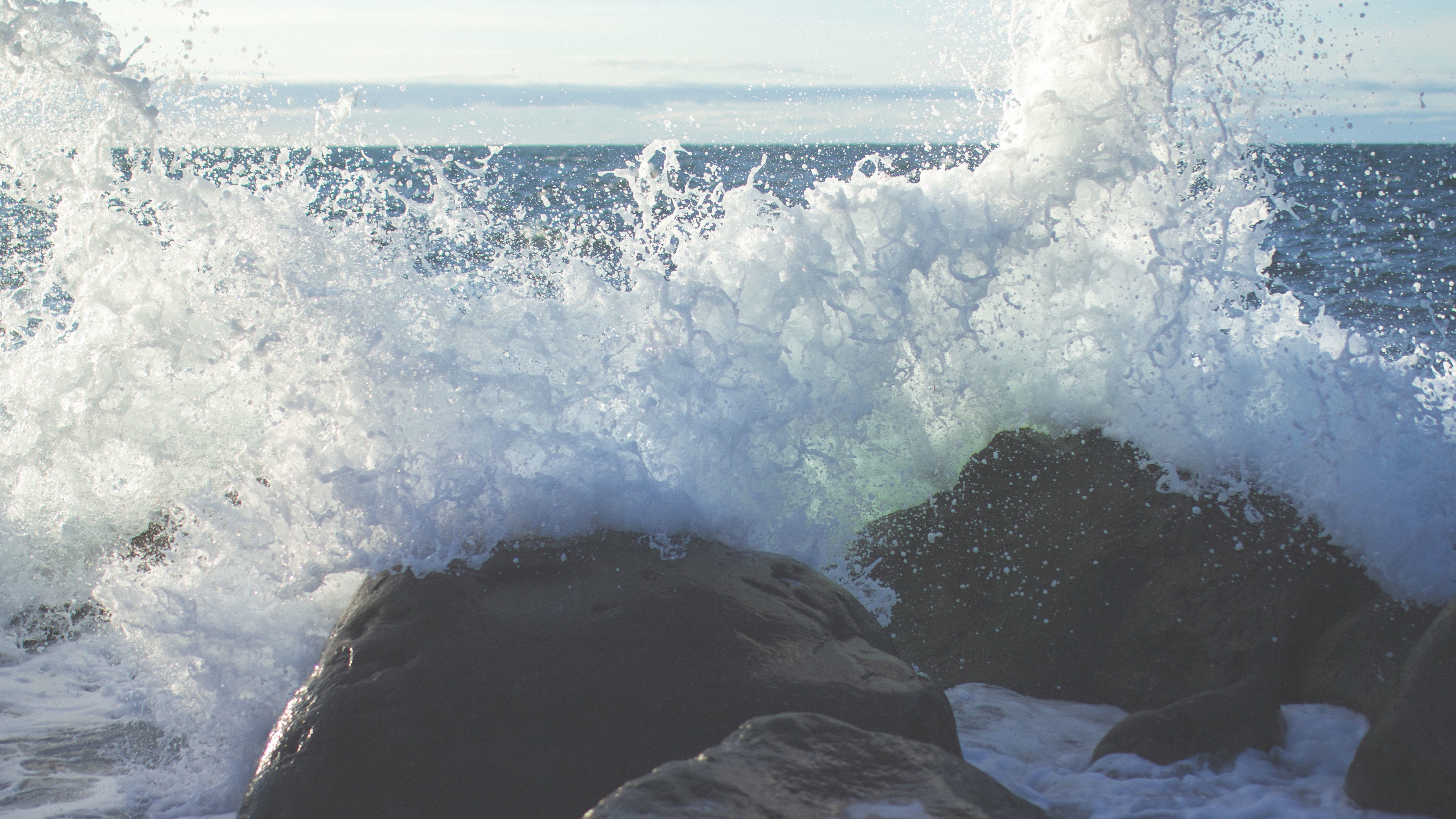Description: A wave crashes on rocks in the ocean near the shore line of a beach in the sun.