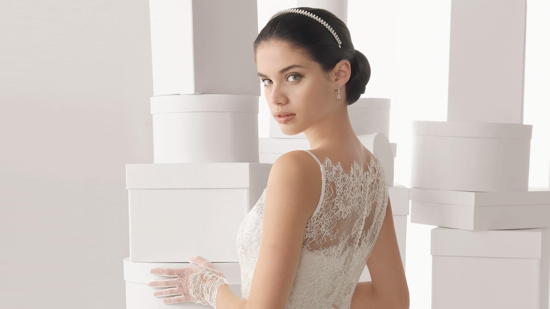 Description: A woman in a wedding dress holding a white box with a diamond necklace on it and a tiara on her head.