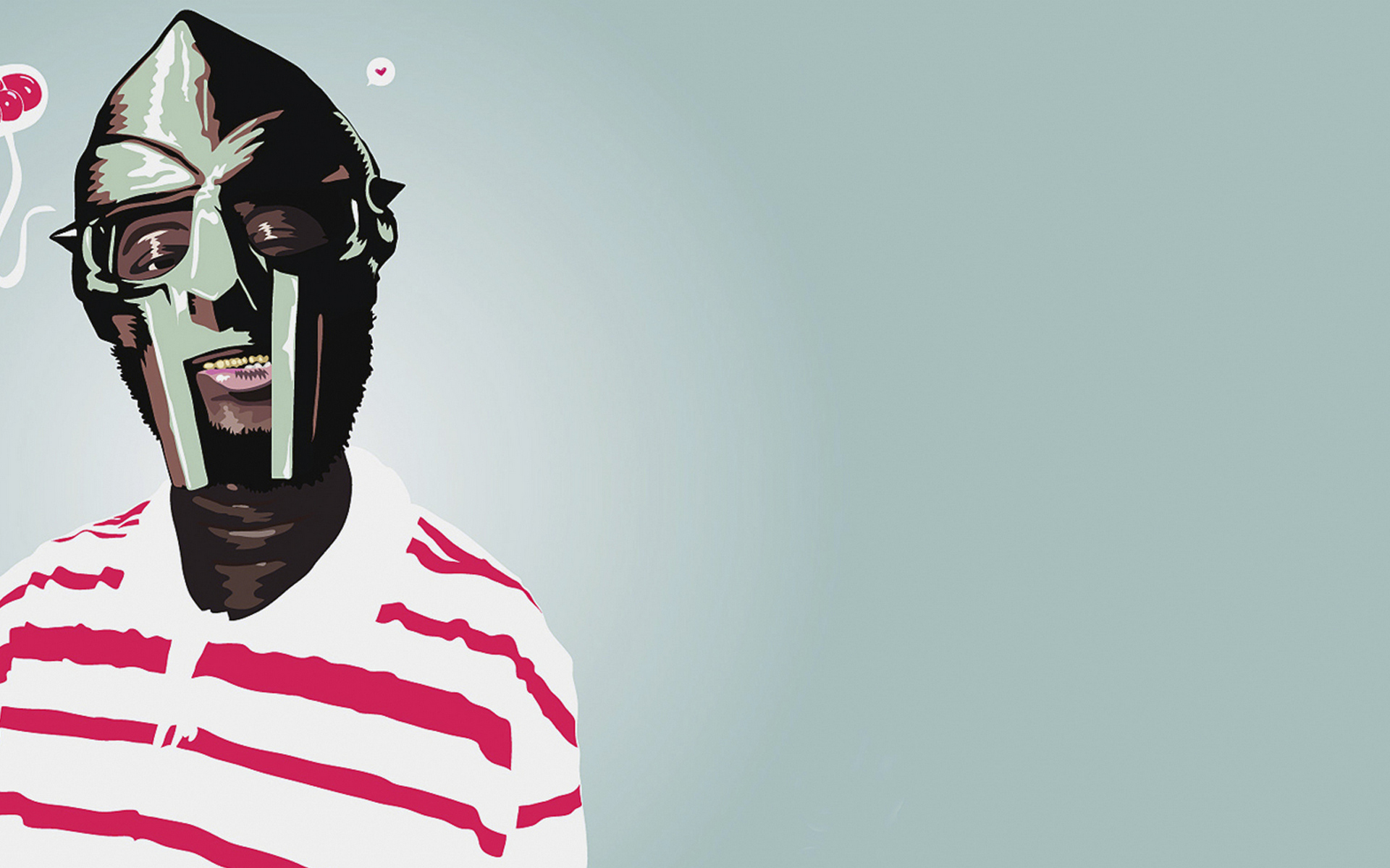 Description: A man with a weird mask on his face and a heart in his mouth.