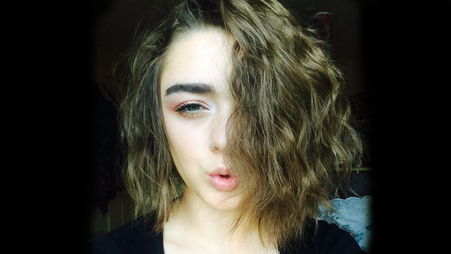 Description: A woman with a weird look on her face and hair blowing in the wind and making a face with her hair blowing in the wind.