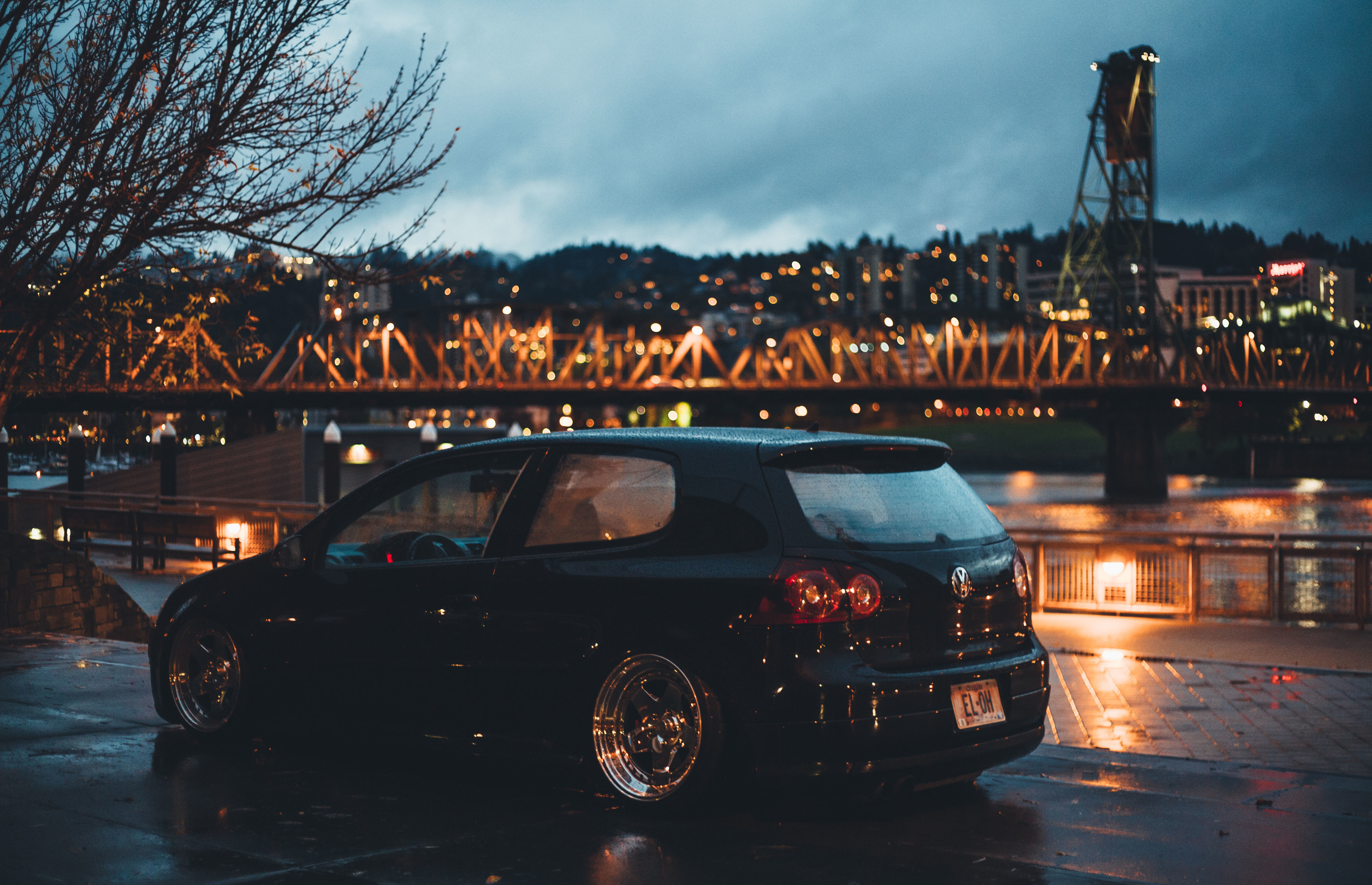 Description: A car parked on a wet parking lot next to a bridge at night with lights on the bridge in the background.