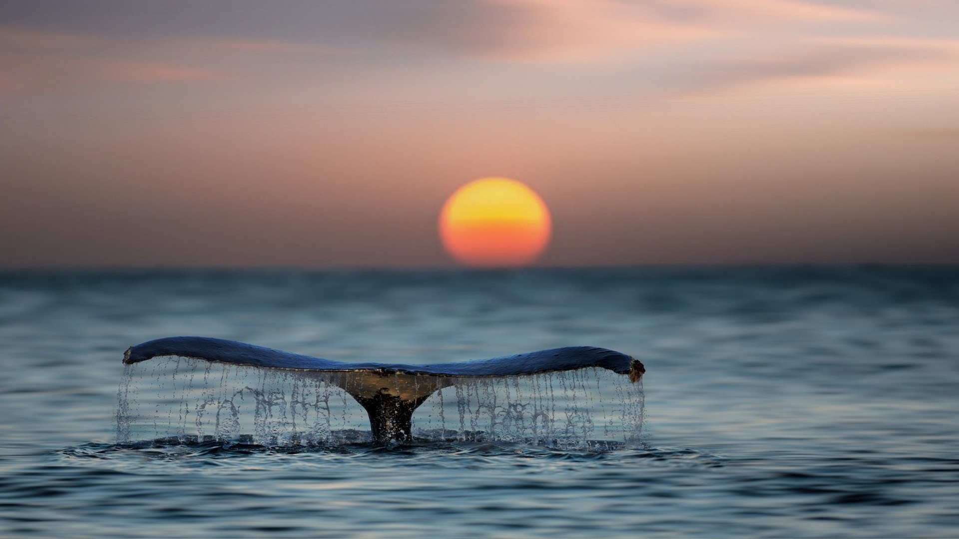 Description: A whale tail flups out of the water at sunset in the ocean with the sun in the background.