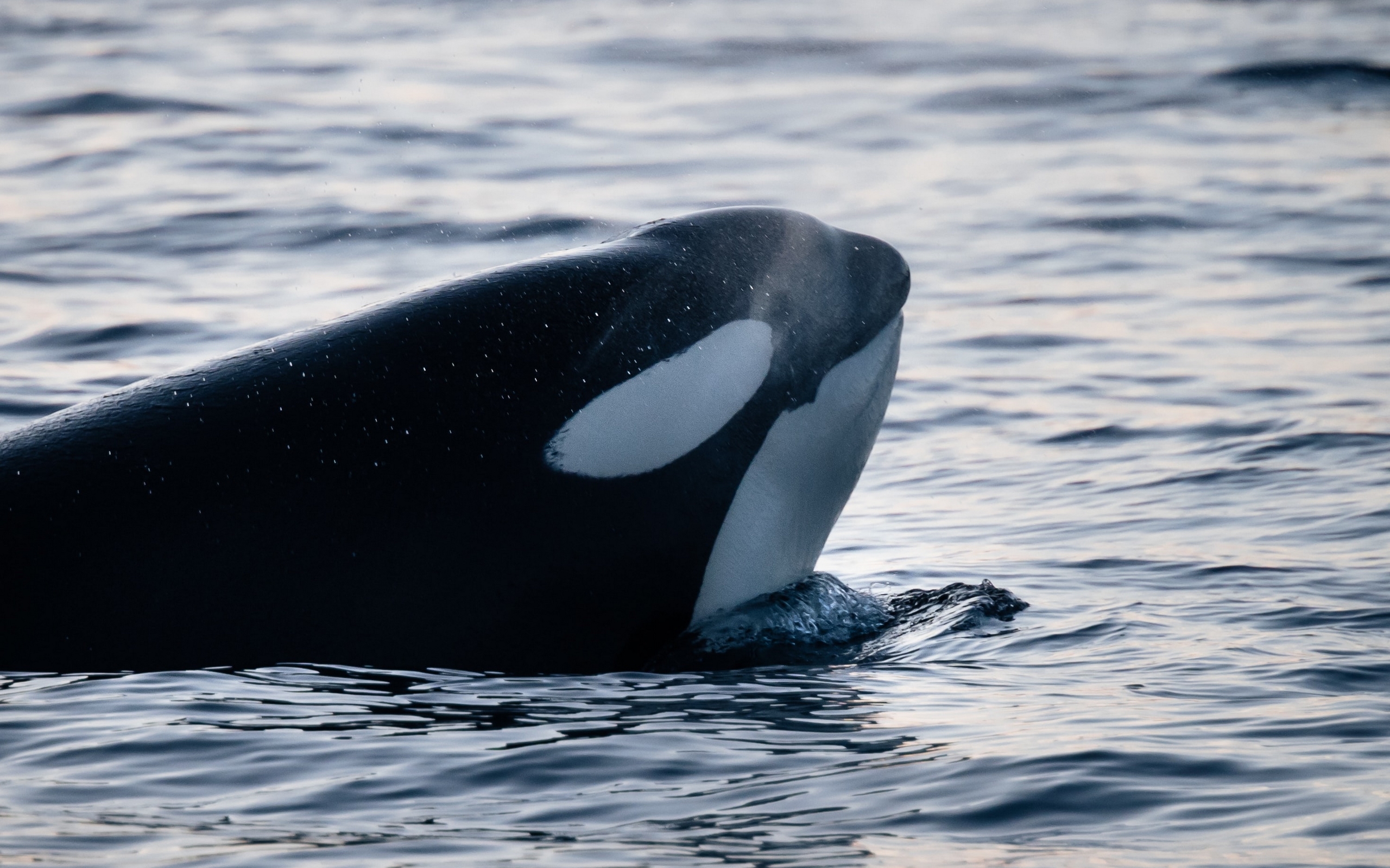 Description: A whale is swimming in the water with its mouth open and it's head above the water's surface.