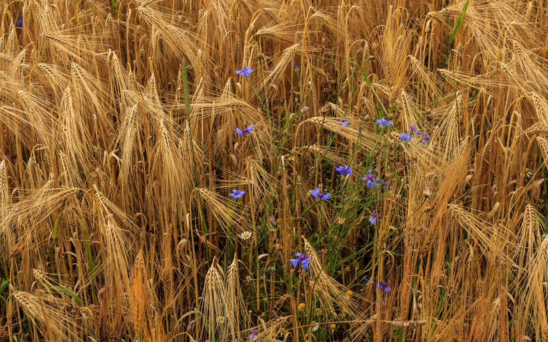 Description: A field of wheat with blue flowers in the middle of it and a blue bird in the middle of the field.