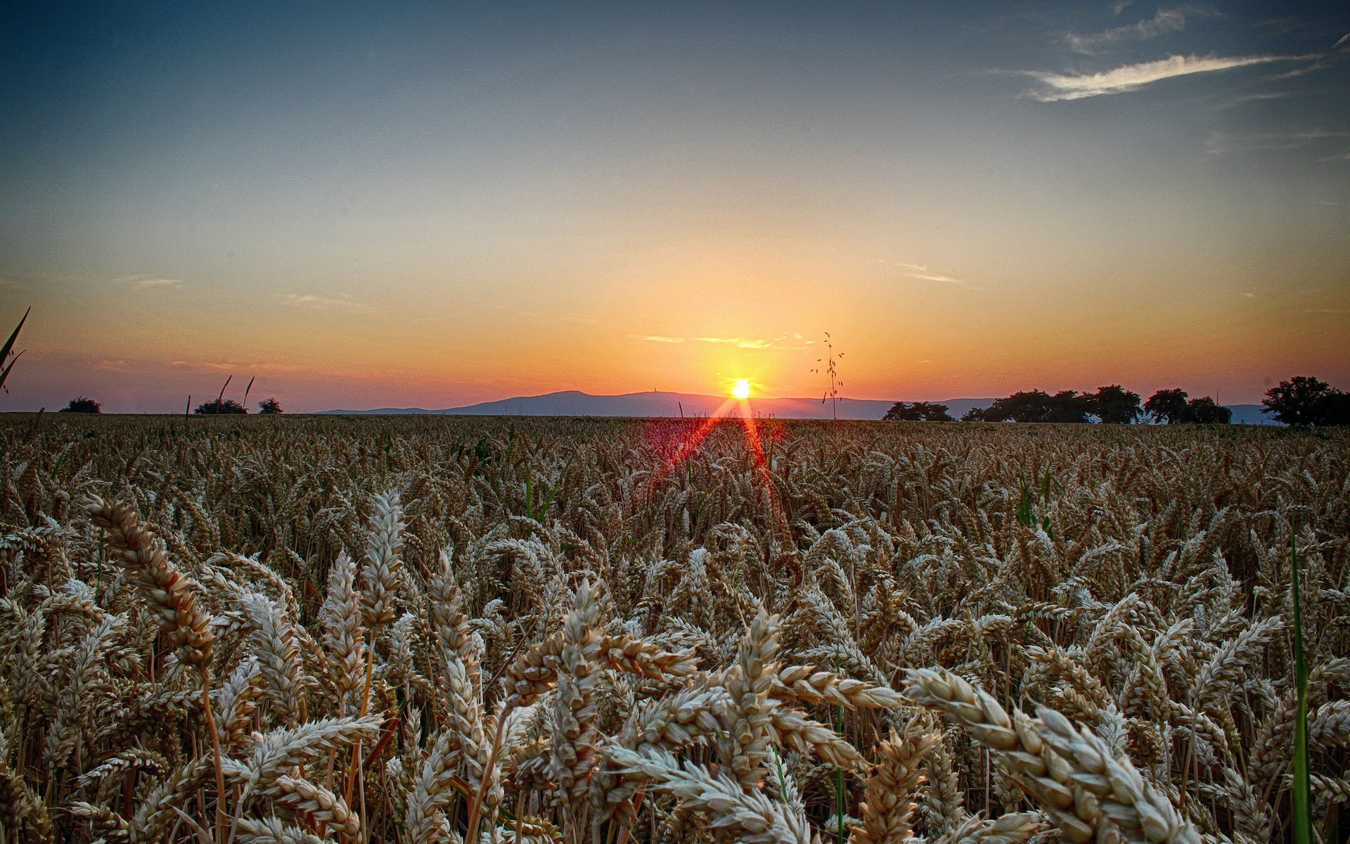 Description: A field of wheat with the sun setting in the background and a few clouds in the sky above it.