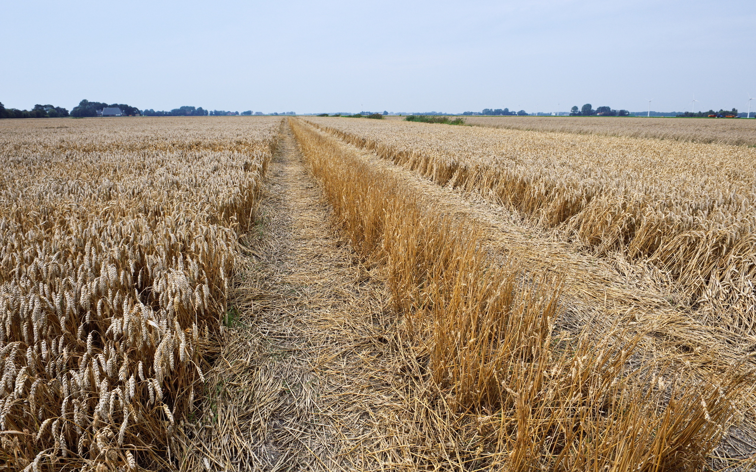 Description: A field of wheat with a line of trees in the background and a blue sky in the background with a few clouds.