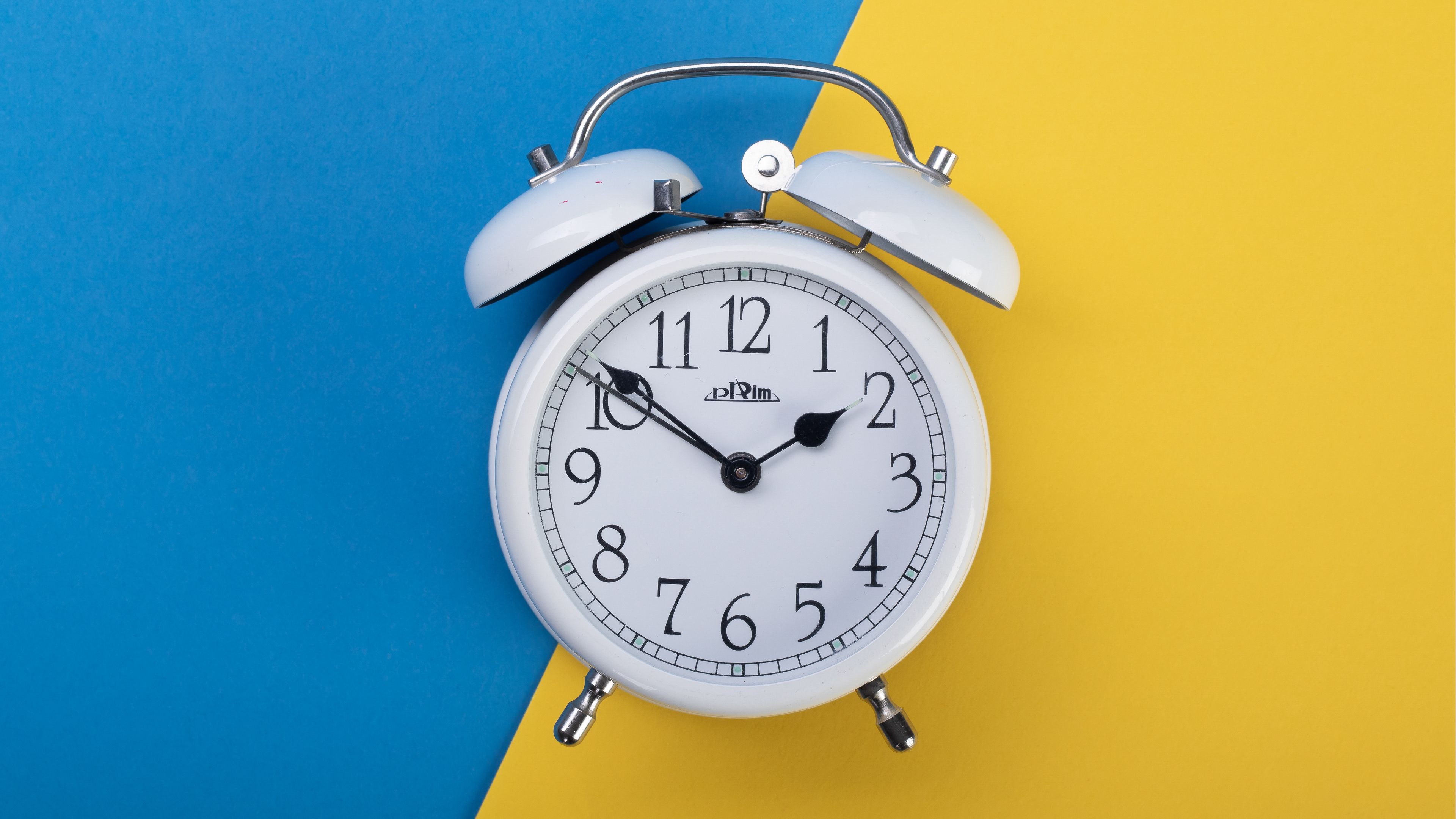 Description: A white alarm clock sitting on top of a blue and yellow wall next to a yellow and blue wall.