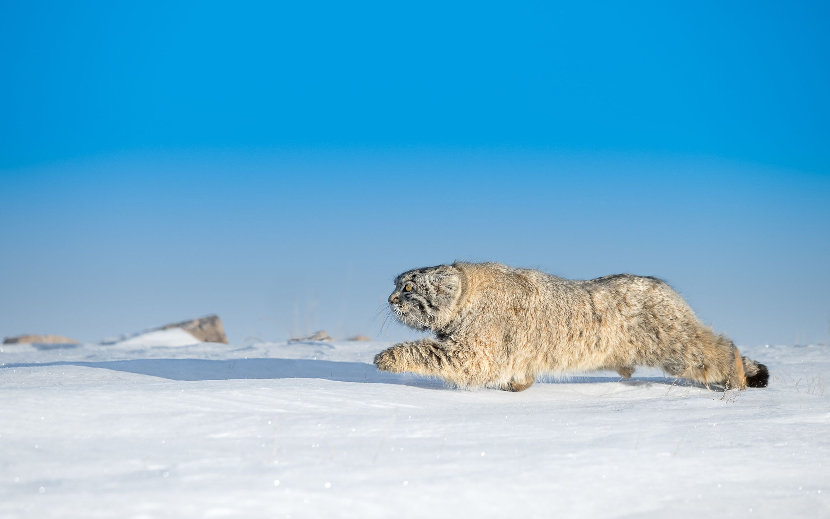 Description: A large white animal walking across a snow covered field with a sky background and a few rocks in the distance.