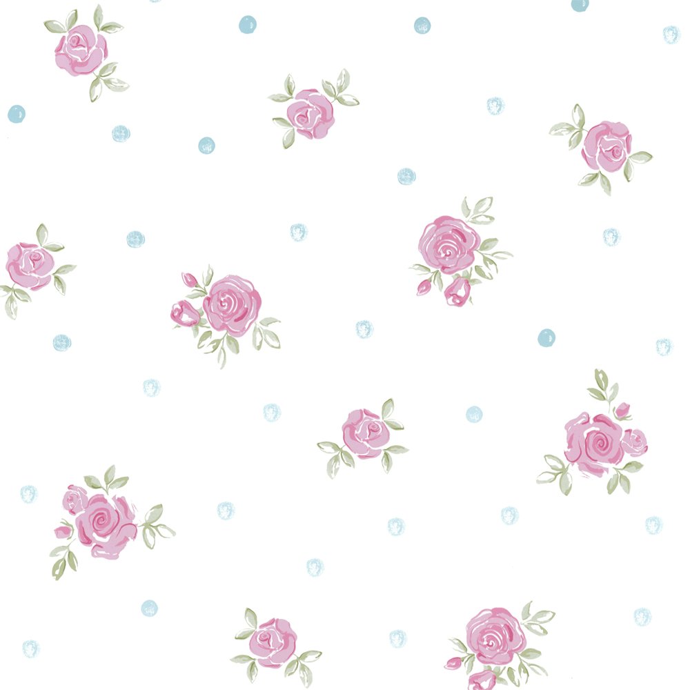 Description: A white background with pink roses and blue dots on it.