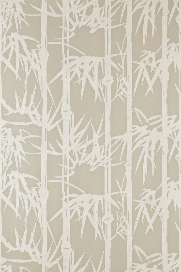 Description: A white and beige wallpaper with bamboo trees on it's side and a white vase on the floor.