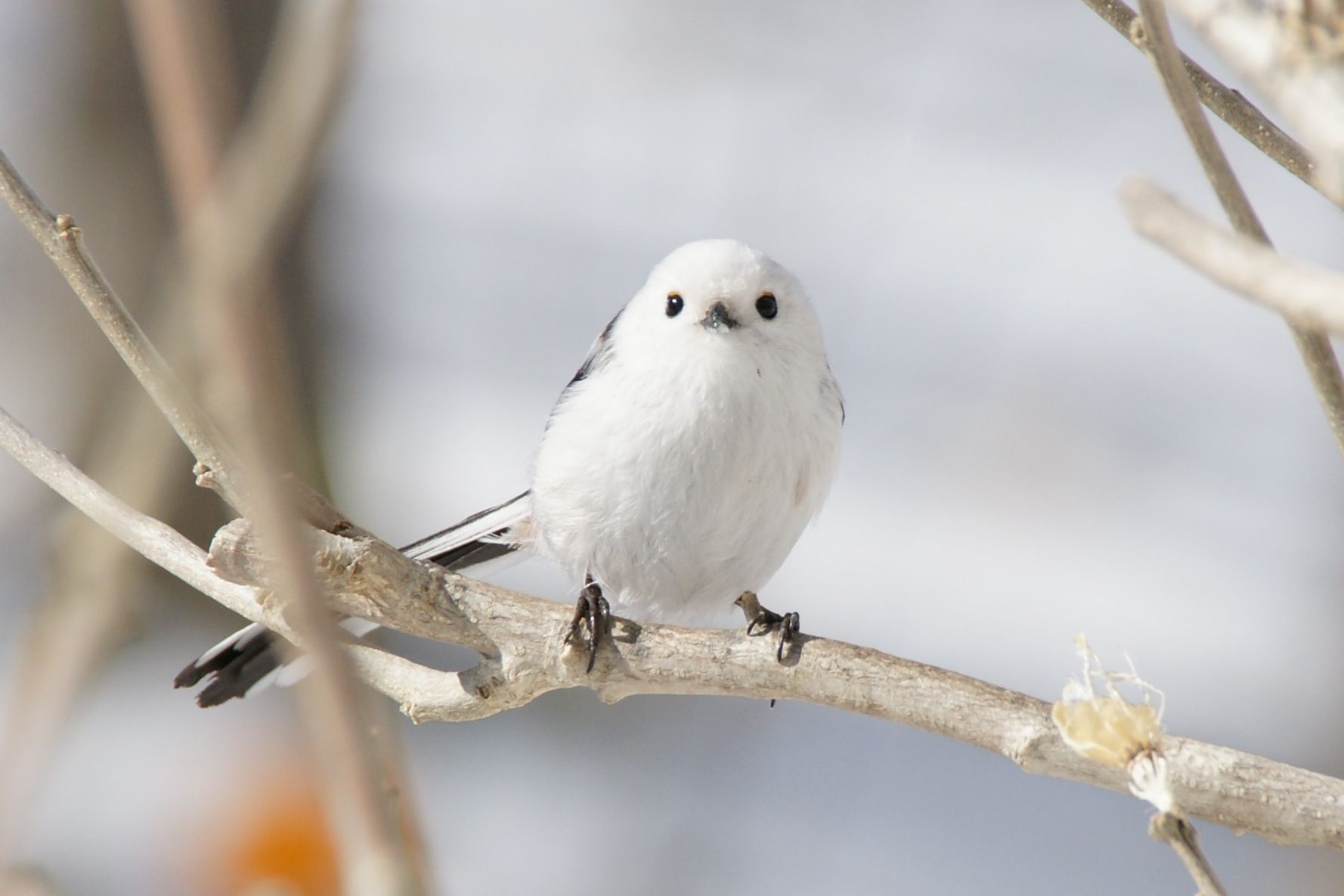 Description: A white bird sitting on a branch of a tree with no leaves on it's branches and a gray sky in the background.