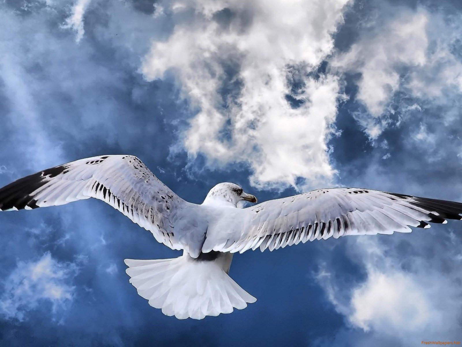 Description: A white bird flying through a cloudy sky with its wings spread out and wings spread wide open.